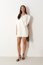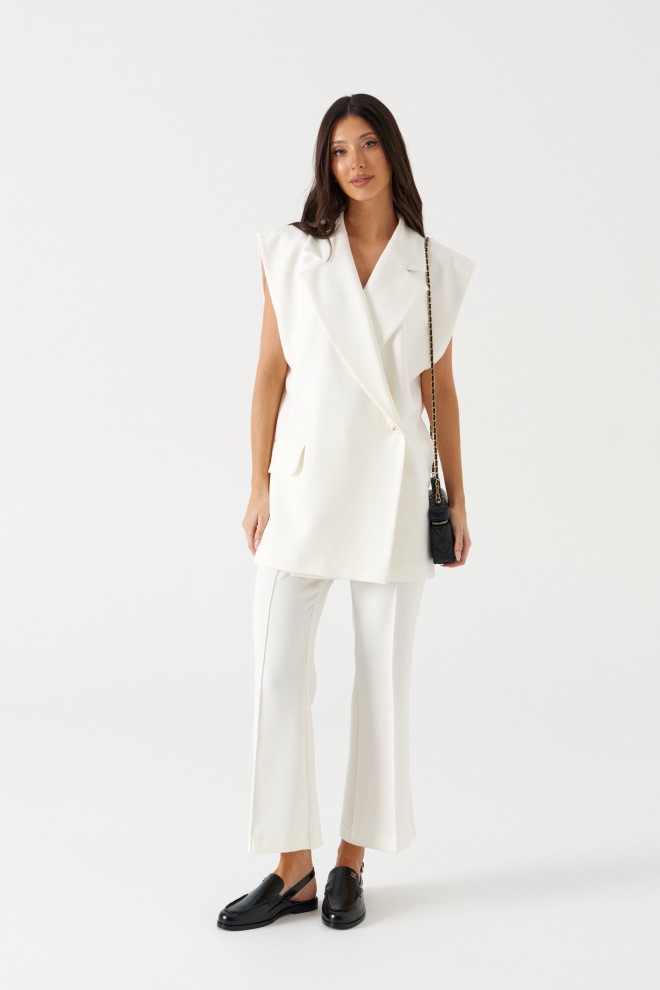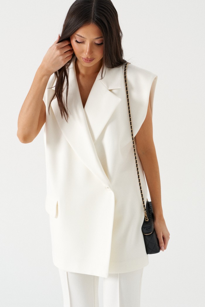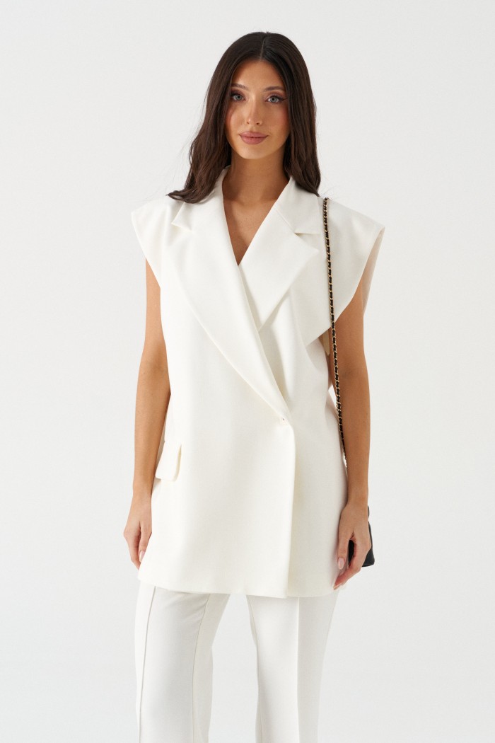 Жилет однобортный, выполнен из костюмной ткани белого цвета. Характеристика: прямой крой, подклад, воротник отложной с широким лацканом, линия плеча спущенная, застёжка смещённая - на одну пуговицу, карман с клапаном (функциональный). Длина по центру спинки 76 см.