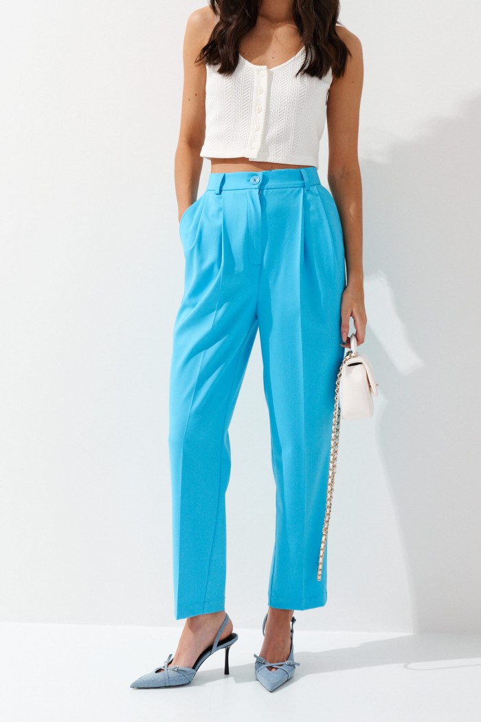 Характеристики: прямой крой, стабильный пояс, по поясу нашиты шлевки, застежка пуговичка молния, декоративные складки по переду изделия, боковые карманы.