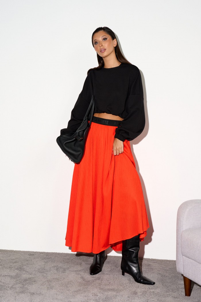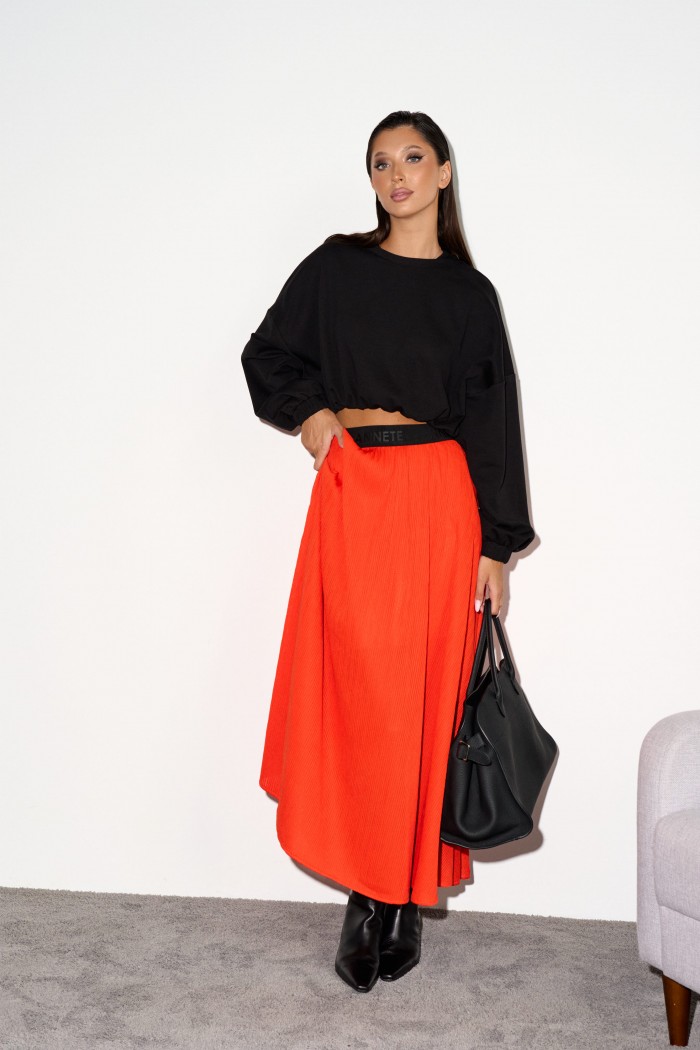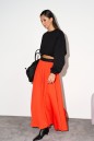 Юбка свободного кроя А образного силуэта выполнена из фактурного полотна цвета мандарин. Характеристики: А-образный силуэт, широкая брендированная резинка, подкладка, в боковых швах карманы. Длина 92 см.