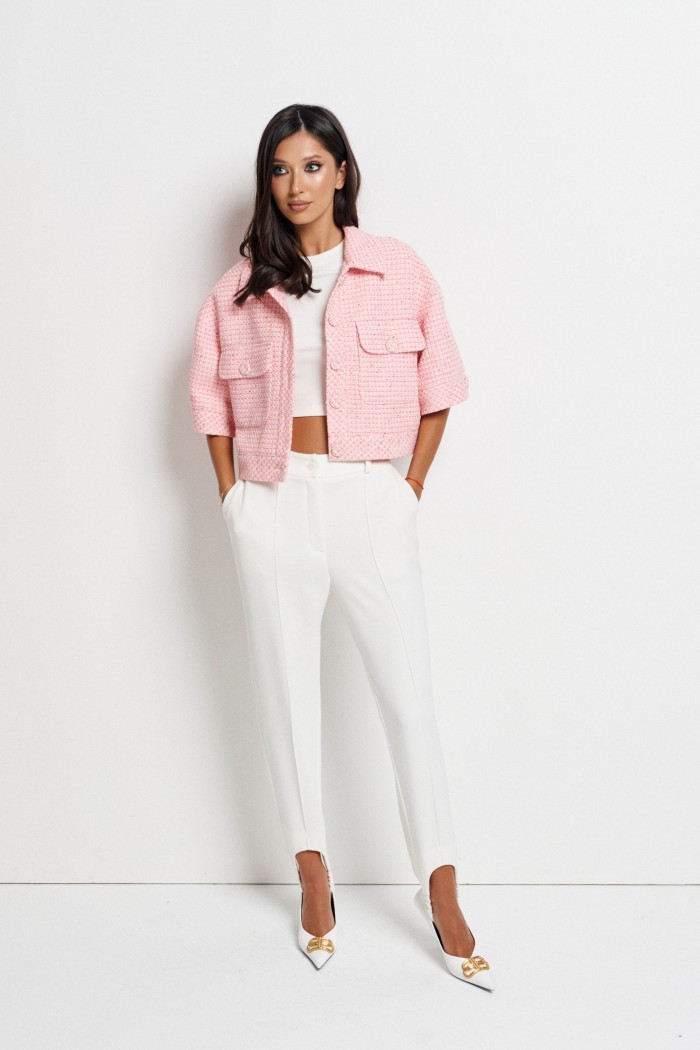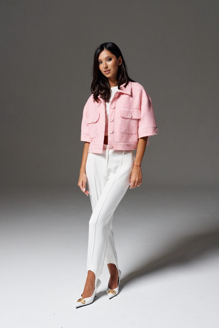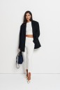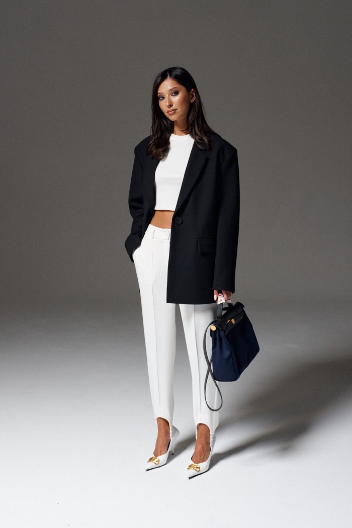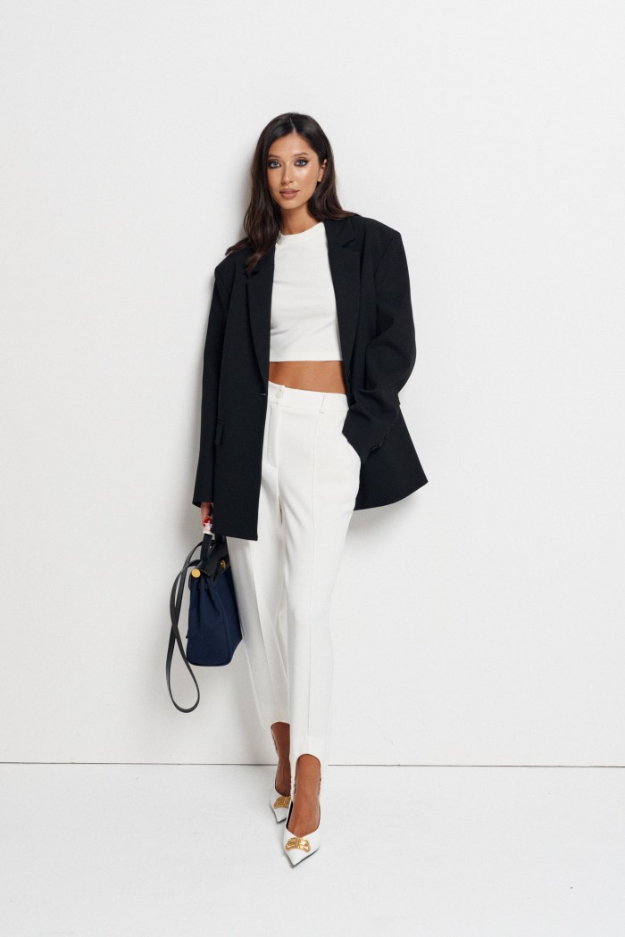 Брюки свободного кроя с эластичными штрипками выполнены из ткани белого цвета.