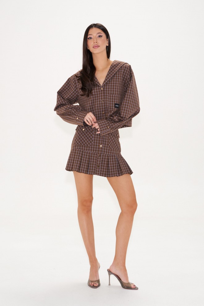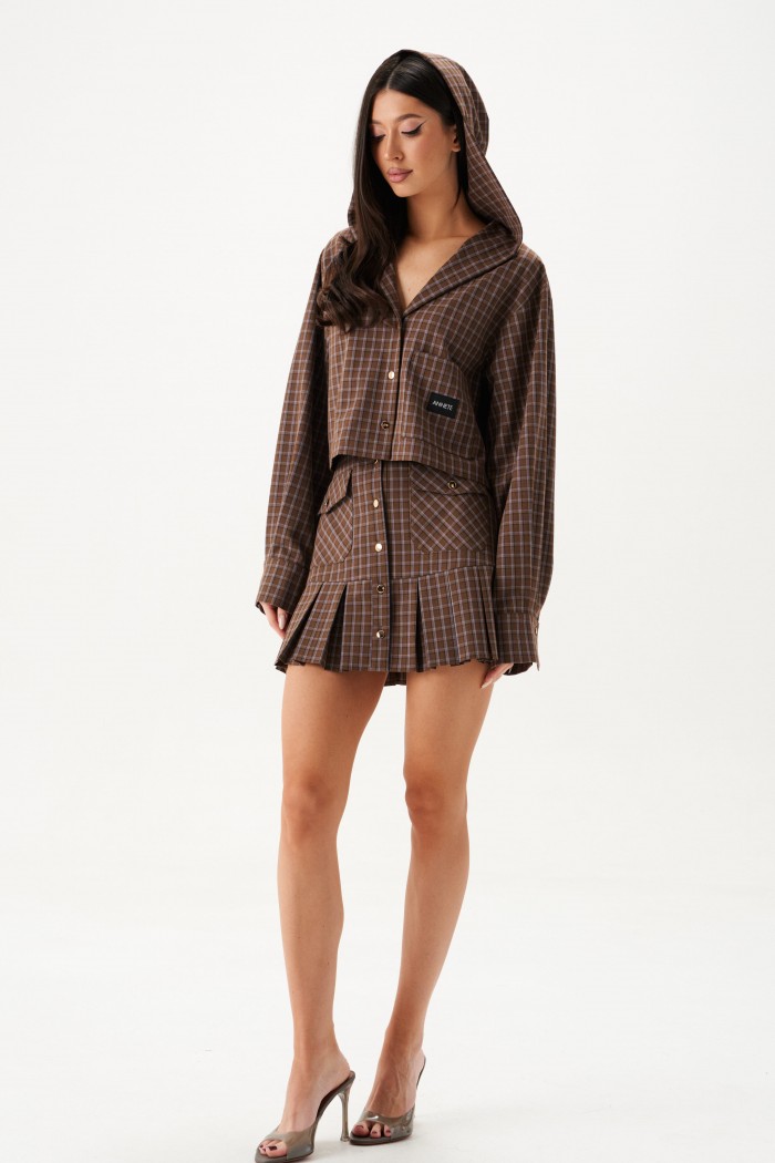 Рубашка прямого укороченного кроя. Характеристики: капюшон, застёжка центральная, длина укороченная, рукав свободный спущенный с широкой манжетой, по переду слева накладной карман с нашивкой. Длина рукава от горловины 79 см. Длина спинки от края горловины 45 см.