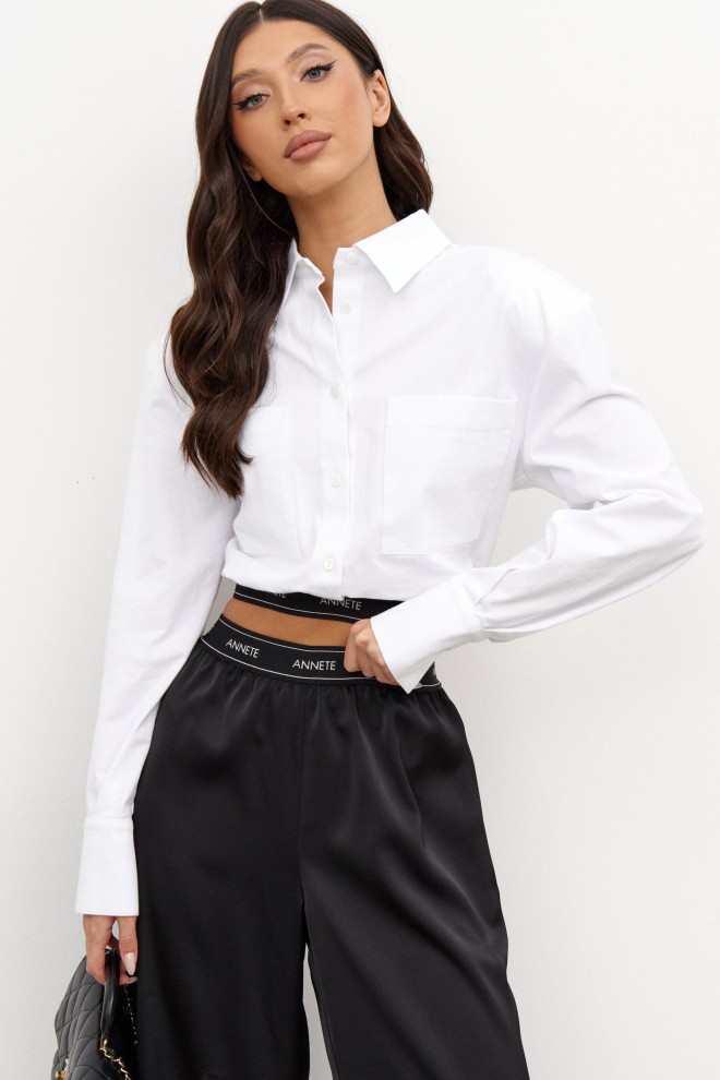 Рубашка укороченная, выполнена из хлопкового полотна. Характеристики: воротник рубашечного типа, застужка на пуговицы, рукав втачной, есть манжет. По переду изделия накладные карманы, по списнке отрезная кокетка. Низ присборен на резинку.