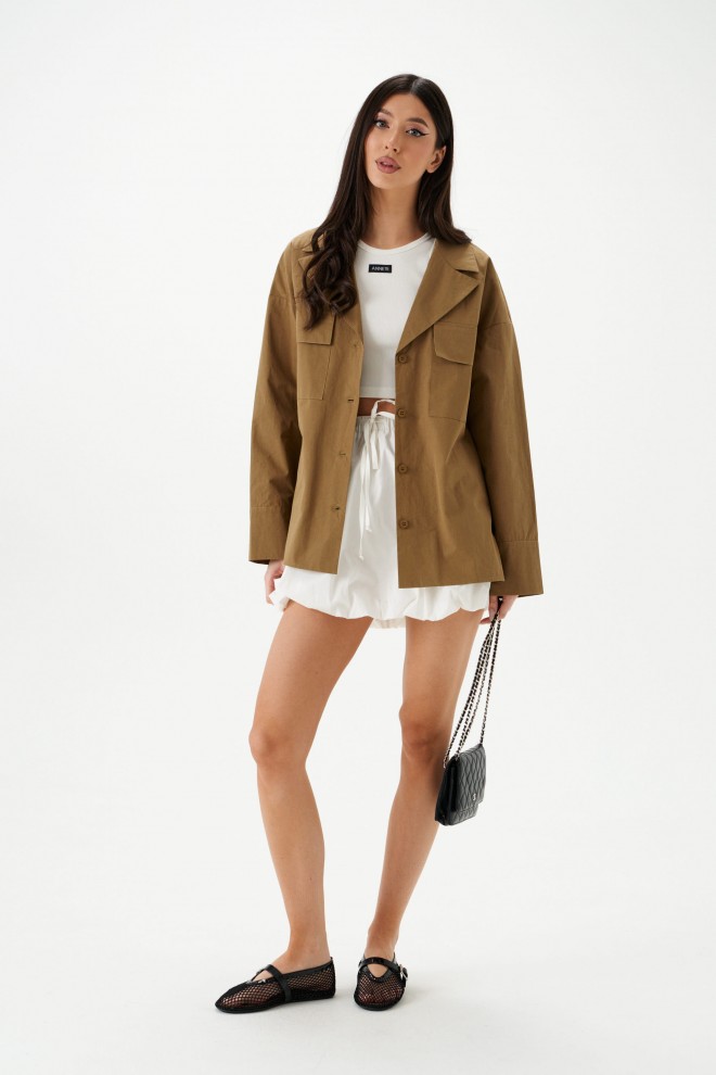Блузка прямого свободного кроя выполнена из хлопка цвета хаки. Характеристики: Прямой крой, воротник пиджачного типа, функциональные накладные карманы по переду изделия, разрезы в боковых швах. Рукав втачной, немного спущен, по низу рукава широкий манжет. Длина по спинке 69 см, длина рукава от горловины 76 см