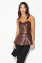 Топ полуприлегающего силуэта выполнен из экокожи шоколадного цвета. Характеристики: полуприлегающий силуэт, отрезной, верх фигурный корсетного плана с регилином, прямая спинка, застежка - потайная тесьма молния в среднем шве заднего полотна изделия. Длина по спинке 41 см.