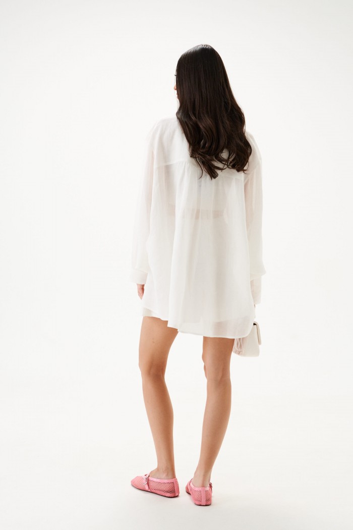 Рубашка свободного кроя выполнена из натурального полотна. Характеристики: рубашка прямого свободного кроя, горловина стойка. Застежка центральная на петли пуговицы, рукав акцентный объёмный, крой рукава «летучая мышь» , спинка отрезная с декоративной сборкой. Длина по спинке 80 см, длина рукава от горловины 76 см.
