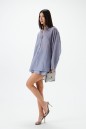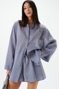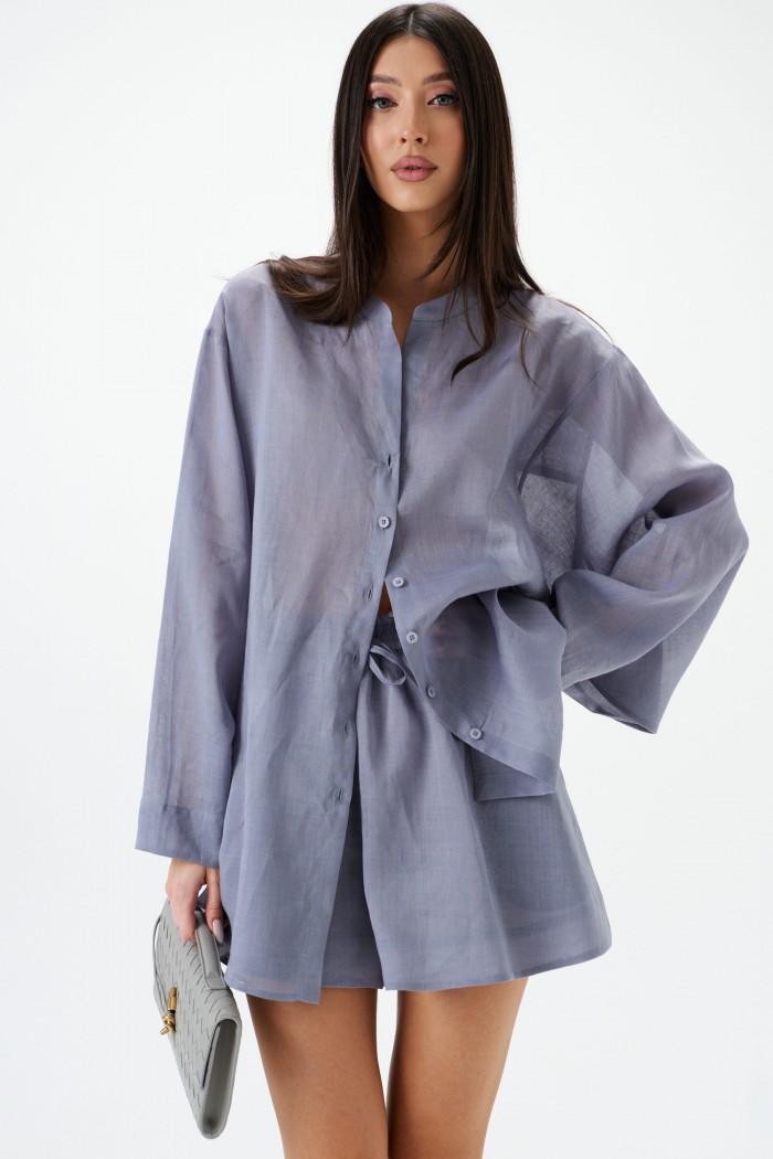 Рубашка свободного кроя выполнена из натурального полотна приглушенного голубого цвета. Характеристики: рубашка прямого свободного кроя, горловина стойка. Застежка центральная на петли пуговицы, рукав акцентный объёмный, крой рукава «летучая мышь» , спинка отрезная с декоративной сборкой. Длина по спинке 80 см, длина рукава от горловины 76 см.
