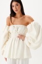 Блуза. Выполнена из двойного муслина молочного цвета. Верхняя часть на резинке. По линии талии широкая венгерка. Низ свободного кроя. Есть подкладка. Рукава-буфы не идут в комплекте. Длина спинки 50 см