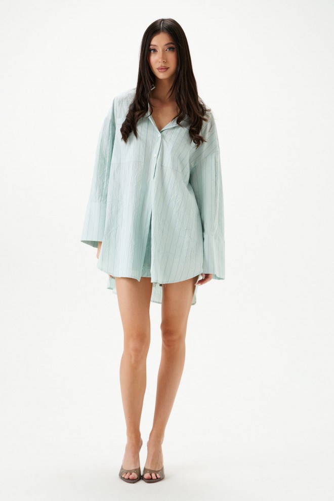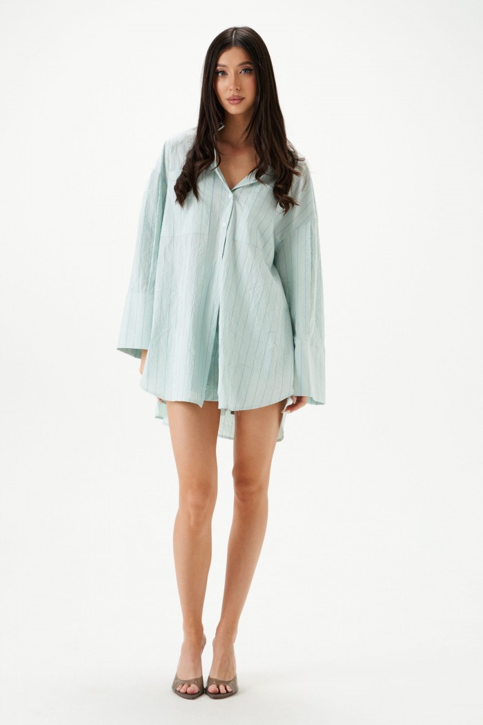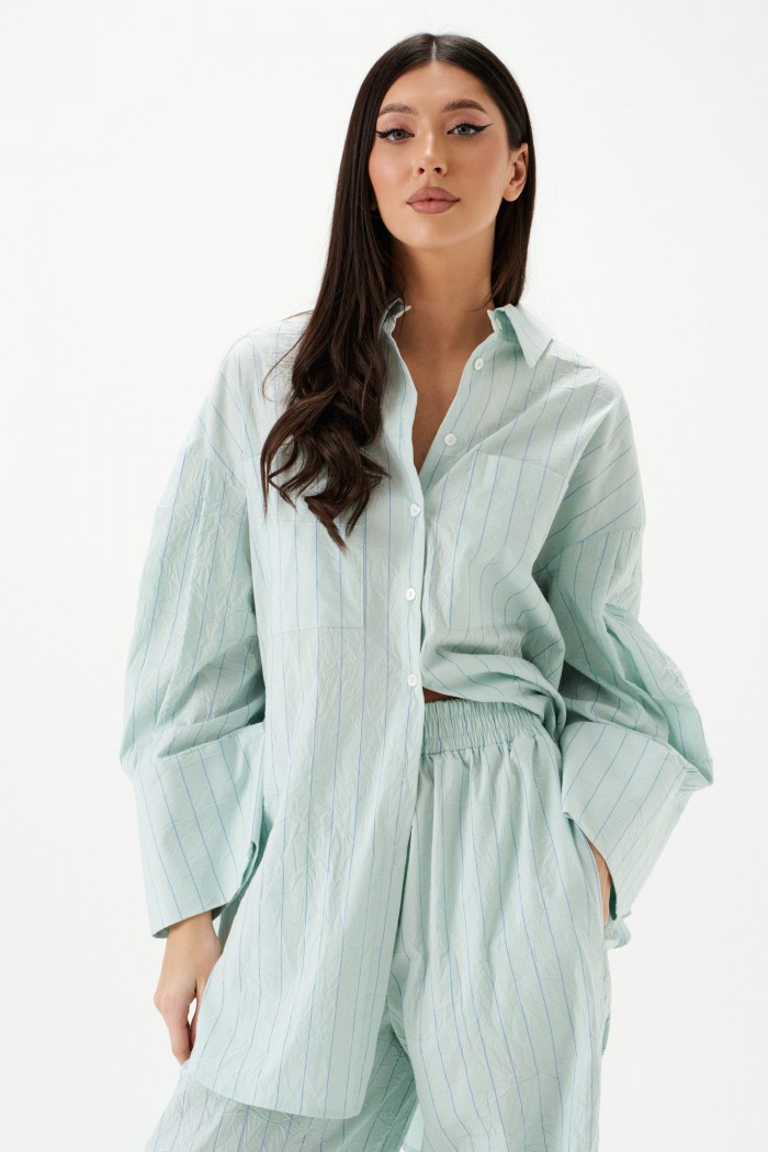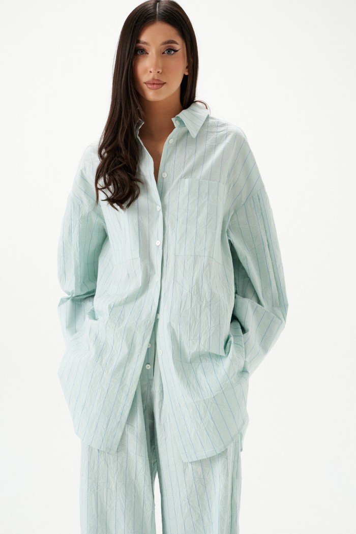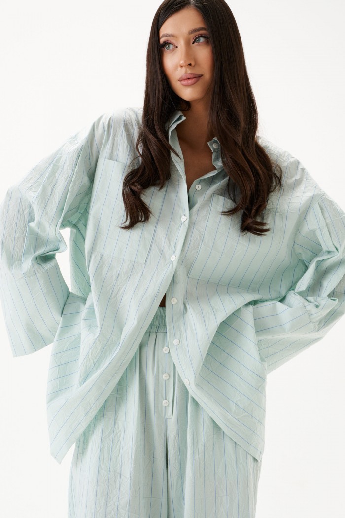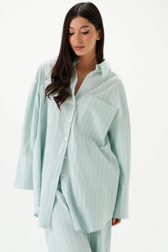 Рубашка прямого свободного кроя выполнена из тнкстильного полотная голубого цвета в полоску. Характеристики: прямой свободный крой, отложной воротник на стойке, застежка центральная на петли пуговицы, по переду крупные карманы, рукав спущен, по рукаву декоративные складки, по низу рукава широкая манжета, спинка отрезная с декоративными складками, низ изделия с плавным срезом.