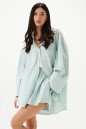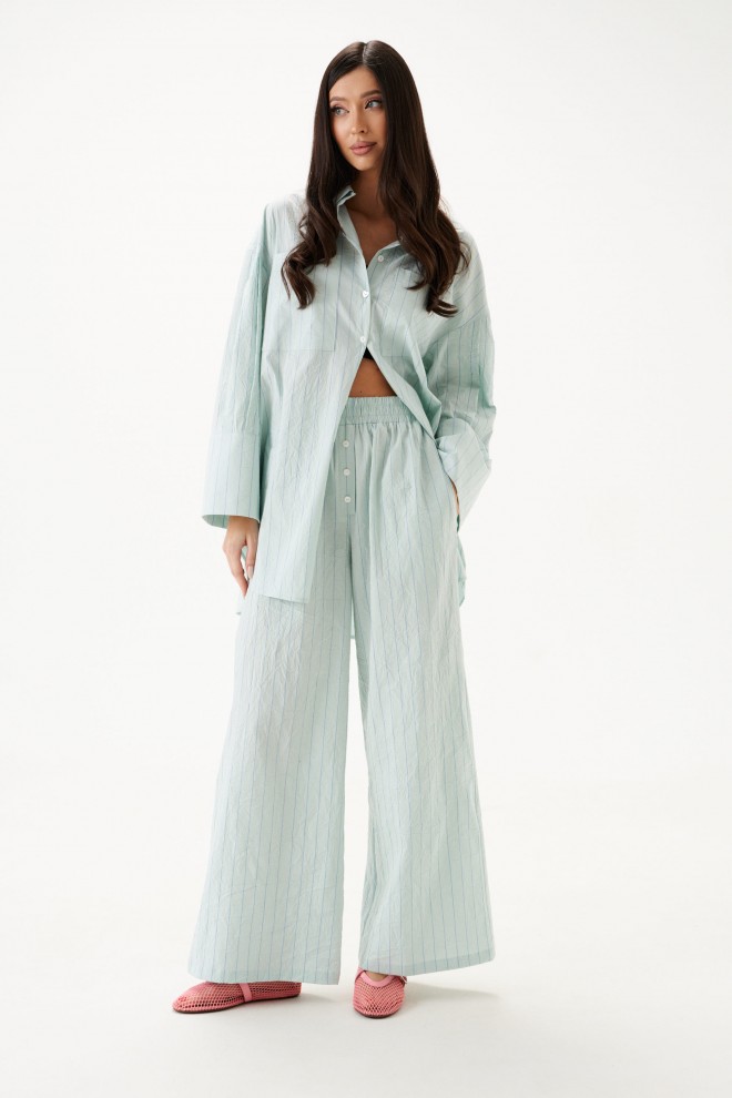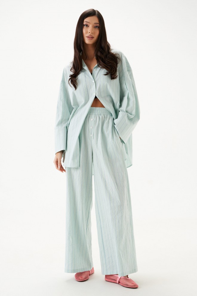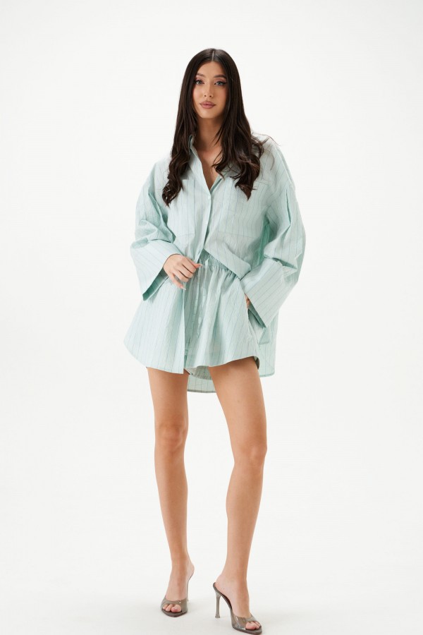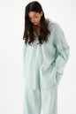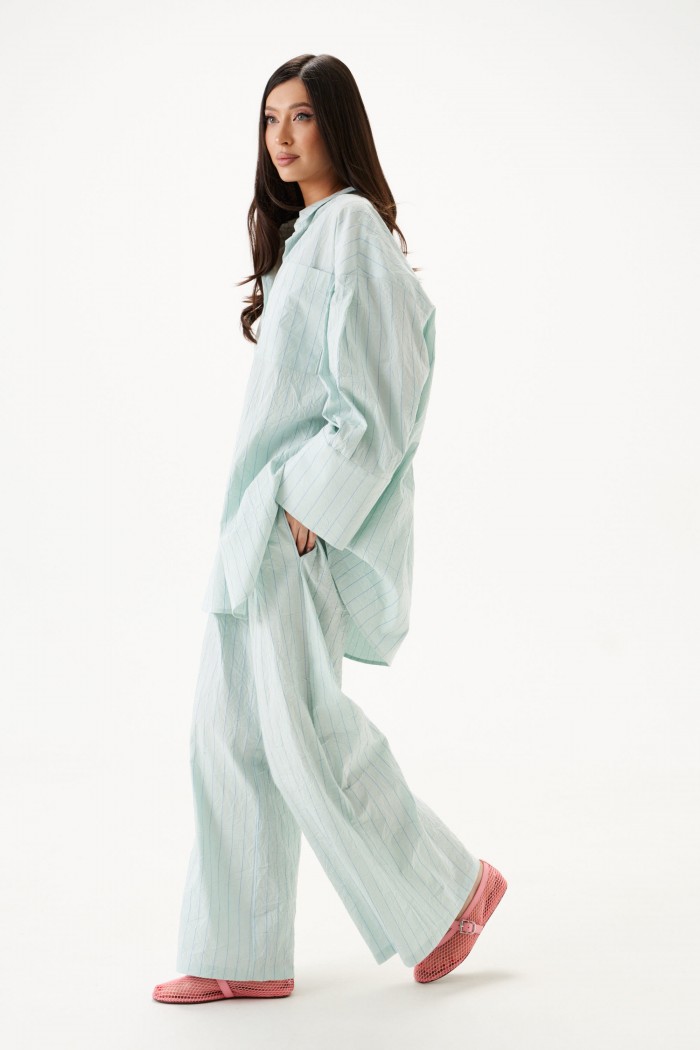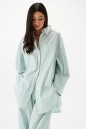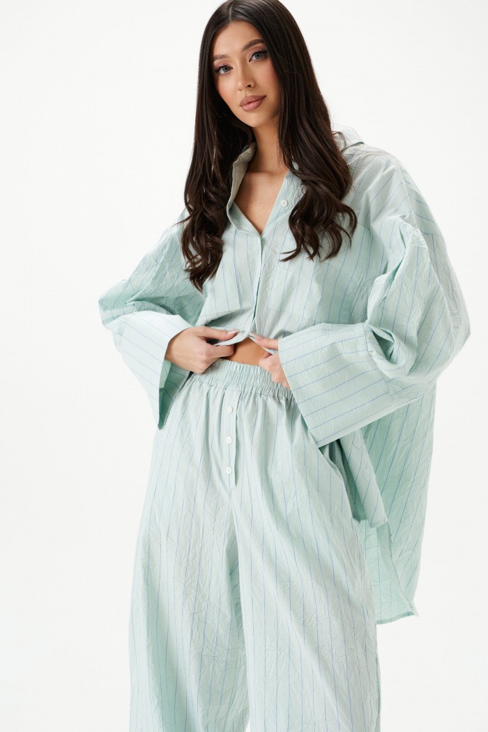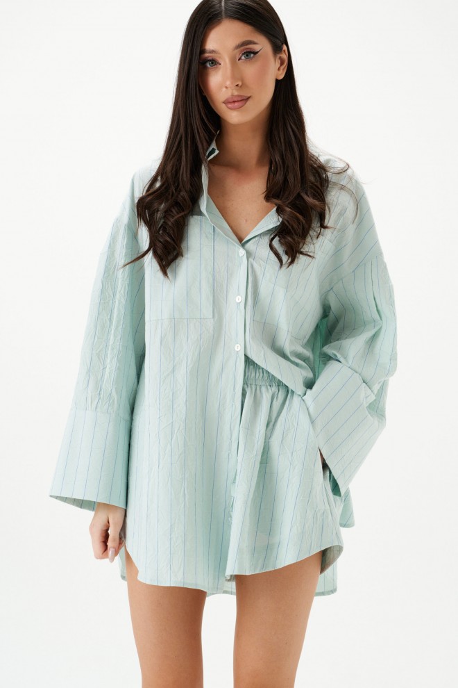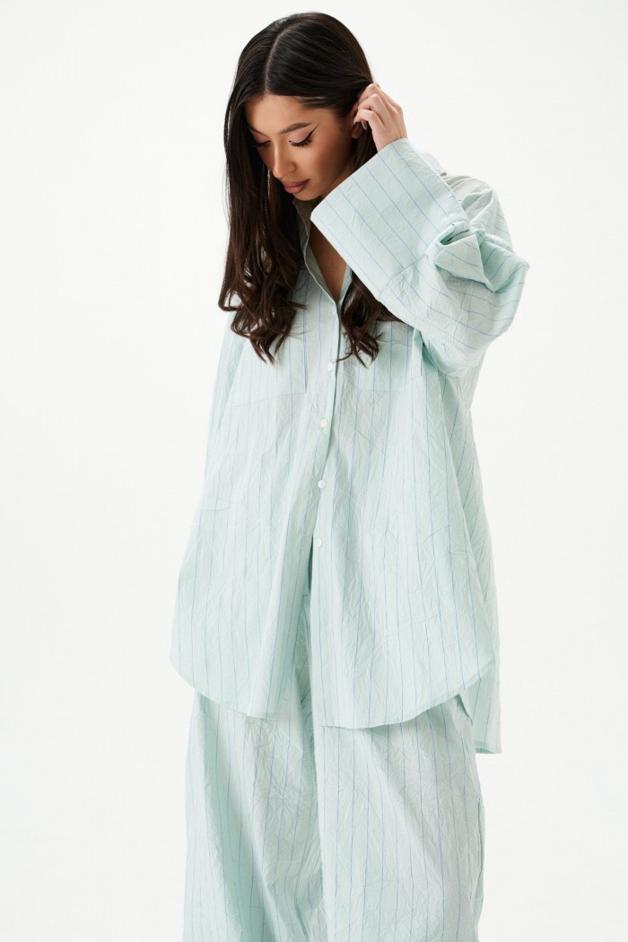 Рубашка прямого свободного кроя выполнена из тнкстильного полотная голубого цвета в полоску. Характеристики: прямой свободный крой, отложной воротник на стойке, застежка центральная на петли пуговицы, по переду крупные карманы, рукав спущен, по рукаву декоративные складки, по низу рукава широкая манжета, спинка отрезная с декоративными складками, низ изделия с плавным срезом.