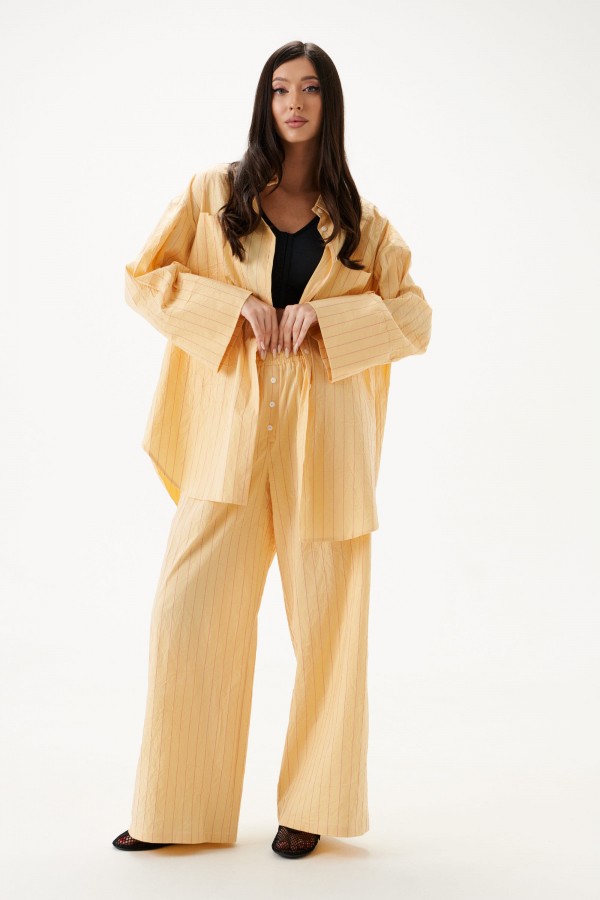 Рубашка прямого свободного кроя выполнена из тексильного полотная нежно-желтого цвета в полоску.