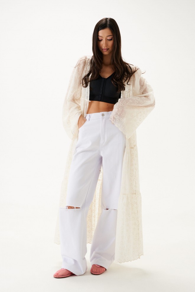 По плечевым полочки кокетки. Рукав широкий - вточной. Застежка центральная на петлю - пуговицу. Длина по спинке 132см, длина рукава 70 см.