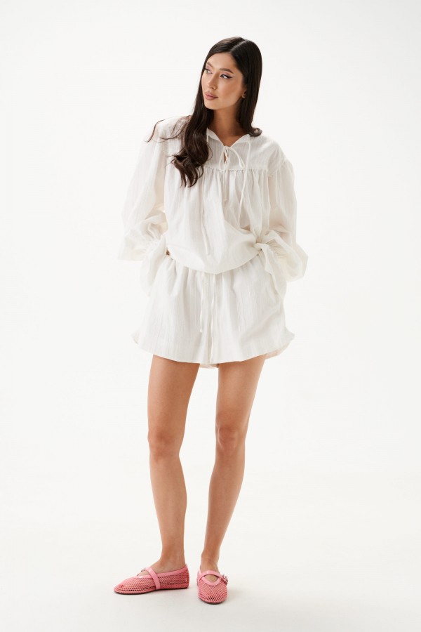 Блуза свободного кроя. Выполнена из хлопкового полотна. По переду и по задней части фигурная кокетка. По переду на кокетке тесьма-завязки (завязки функциональные). Рукав втачной, немного спущен. Низ рукава с резинкой и рюшей. Длина рукава 73 см. Длина спинки 65 см