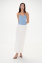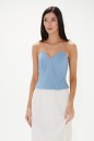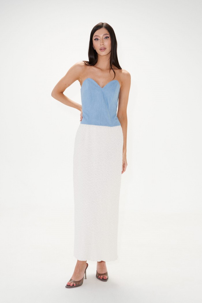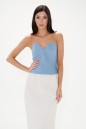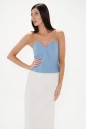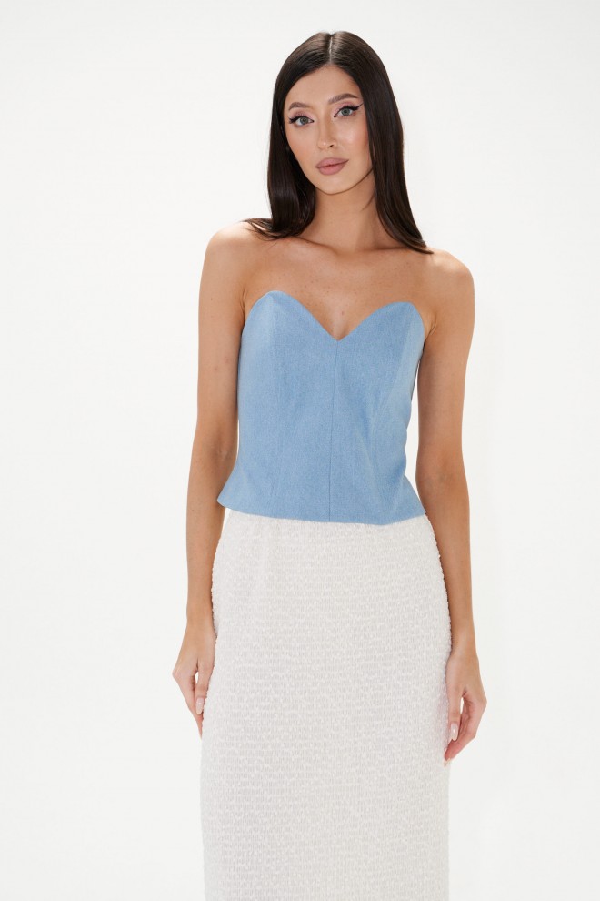 Корсет с фигурным вырезом выполнен из полотной джинсовой ткани голубого цвета.