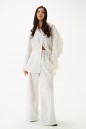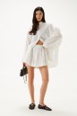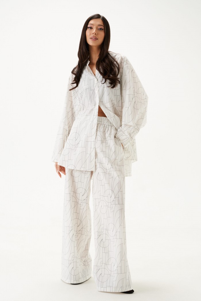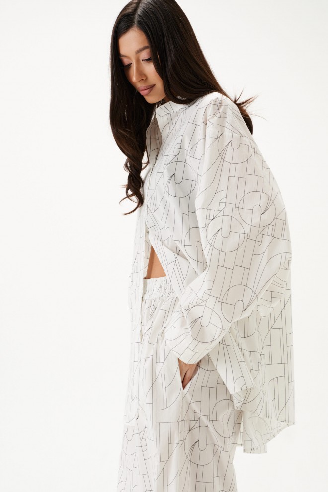 Рубашка свободного кроя выполнена из хлопкового полотна белого цвета с геометрическим принтом. Характеристики: рубашка прямого свободного кроя, горловина стойка. Застежка центральная на петли пуговицы, рукав акцентный объёмный, крой рукава «летучая мышь» , спинка отрезная с декоративной сборкой. Длина по спинке 80 см, длина рукава от горловины 74 см.