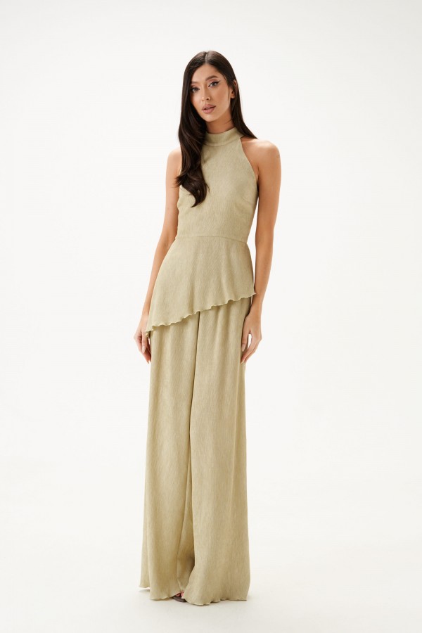 Длинная блузка полуприлегающего силуэта, на бретелях. По груди нагрудные вытачки. Лиф блузона на подкладке. Бретели узкие на регуляторах. Застежка центральная на шнурки-завязки. Длина по спинке 113см.
