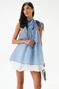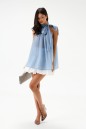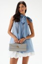 Блуза А-силуэта. Выполнена из лёгкого струящегося полотна голубого цвета. Без подкладки. Горловина – стойка со сборкой со втянутой декоративной лентой, формирующей бант. Длина спинки 71 см