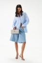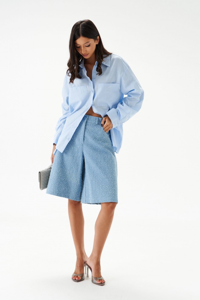 Рубашка свободного кроя. Выполнена из льняного хлопкогово полотна голубого цвета. Прямой крой. Горловина круглая с отложным воротником на стойке. Рукав втачной, немного спущен, с манжетой с пуговичками. В боковых швах разрезы 27 см. Длина рукава от края горловины 76 см. Длина рубашки по спинке 71 см.