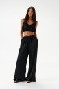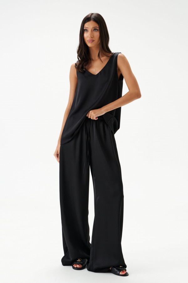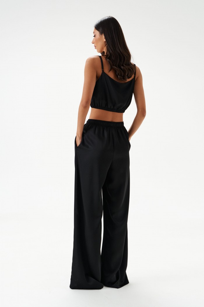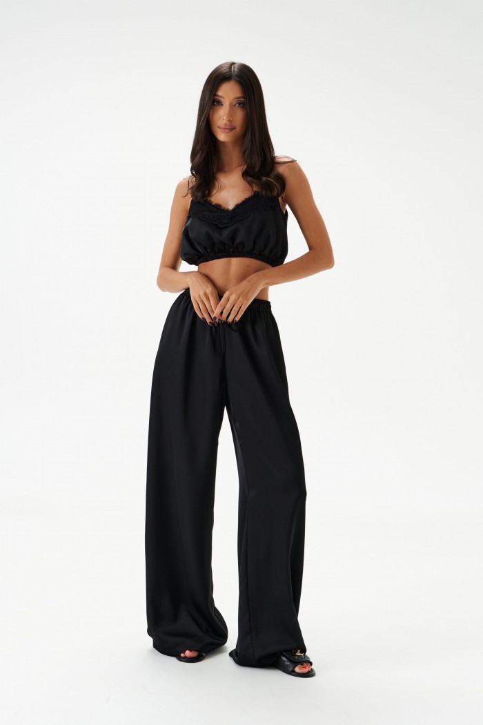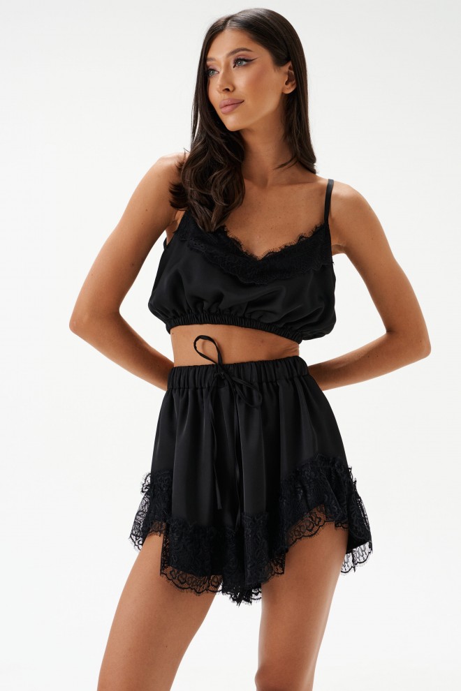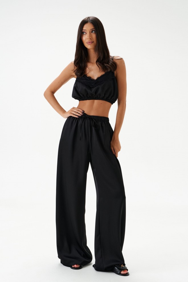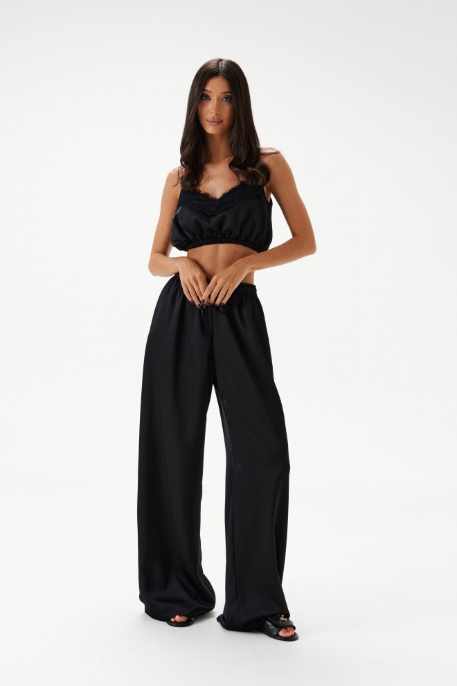 Блузка выполнен из струящейся ткани черного цвета. Характеристики: укороченная блузка, регулируемые бретели, фигурный вырез горловины, по горловине ажурное кружево, низ изделия на резинке. Длина по спинке 21 см.