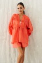 Блуза свободного кроя. Выполнена из полупрозрачного полотна рами кораллового цвета. Вырез горловины V-образный. Рукав втачной, спущенный, низ присборен на резинку. По переду выше линии груди и по спинке отрезная деталь со сборкой, по переду с завязками. Спинка с кокеткой. Длина рукава от линии втачивания 64 см. Длина спинки 70 см