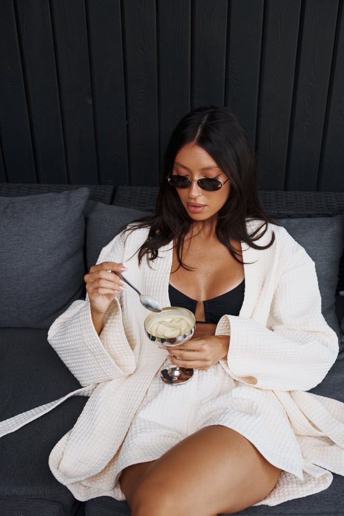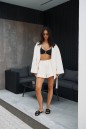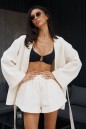 Кардиган свободного кроя. Выполнен из фактурного хлопкового полотна светло-бежевого цвета. Рукав втачной, спущенный. На уровне линии талии шлёвки. В комплекте пояс из ткани основного изделия. Длина рукава от линии втачивания 55 см. Длина спинки 74 см