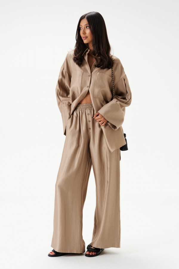 Рубашка прямого свободного кроя выполнена из текстильного полотна. Характеристики: прямой свободный крой, отложной воротник на стойке, застежка центральная на петли пуговицы, по переду крупные карманы, рукав спущен, по рукаву декоративные складки, по низу рукава широкая манжета, спинка отрезная с декоративными складками, низ изделия с плавным срезом. Длина по спинке 80 см, длина рукава от края горловины 74 см.