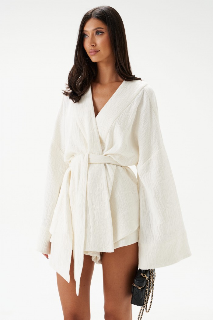 Кардиган свободного кроя. Выполнен из хлопкового полотна белого цвета – муслин. Без подкладки. Вырез горловины V-образный. Рукав втачной, спущенный, широкий. На уровне линии талии шлёвки. В комплекте пояс из основной ткани изделия. Длина рукава от линии втачивания 47 см. Длина спинки 70 см. Кардиган дополнят шорты А1530