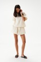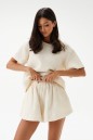Блуза свободного кроя. Выполнена из фактурного хлопкового полотна светло-бежевого цвета. Вырез горловины круглый. Рукав втачной. В среднем шве заднего полотна застёжка -молния. Длина рукава от линии втачивания 19,5 см. Длина спинки 53 см