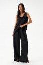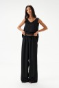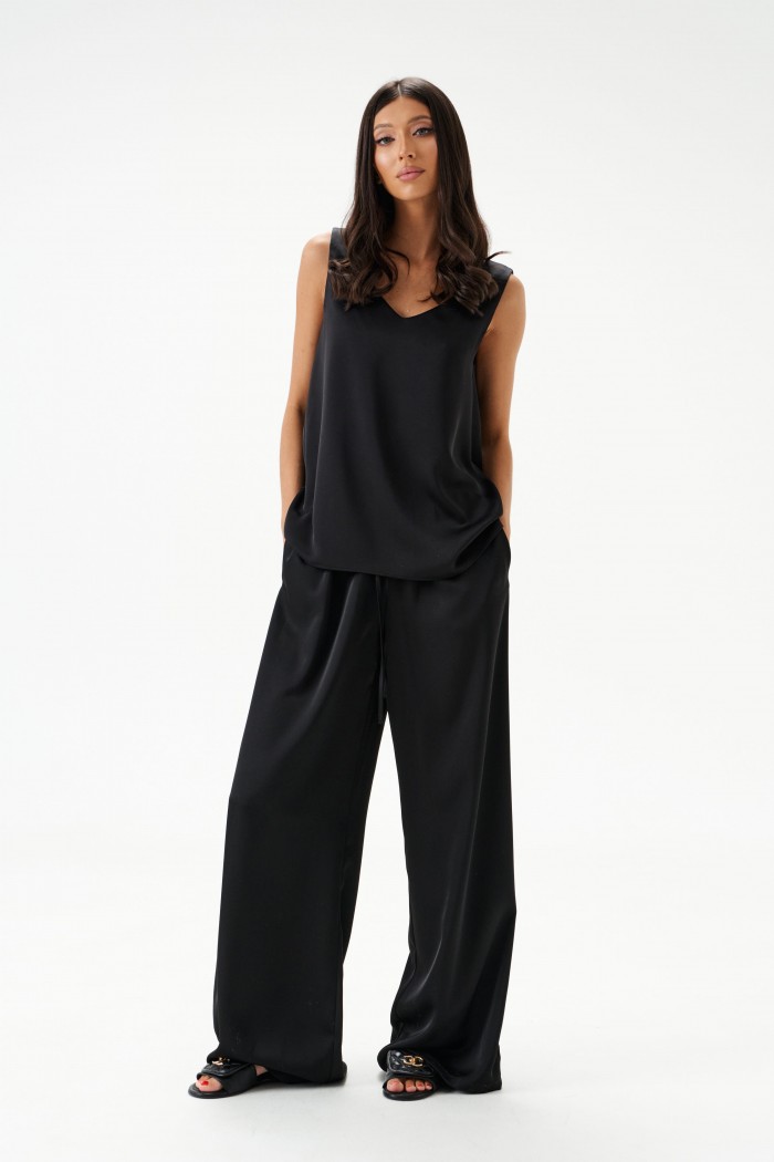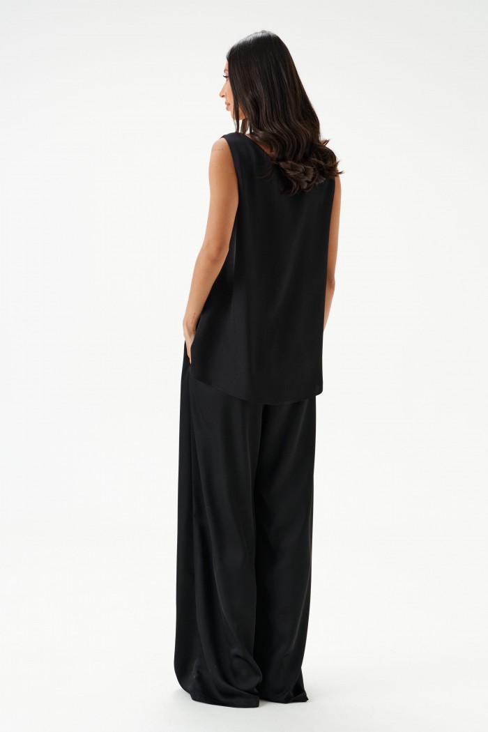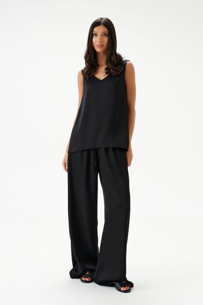 Блузон в крое трапеция, выполнен из струящейся ткани черно цвета. Характеристика: крой трапеция - расширяется к низу, широкие бретели, v-образный вырез, спинка изделия чуть удлиненна. Длина изделия по спинке 62см.