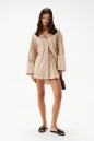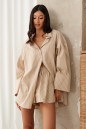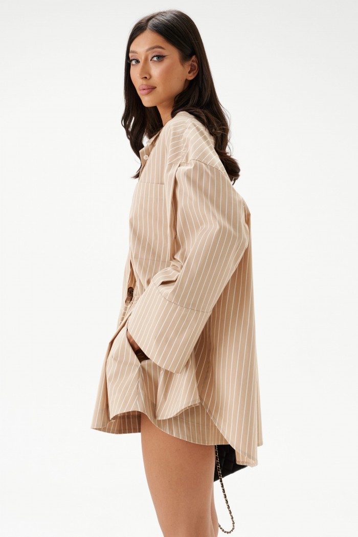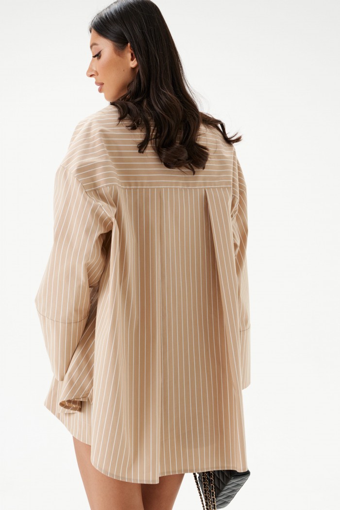 Рубашка прямого свободного кроя выполнена из текстильного полотная песочного цвета в белую полоску. Характеристики: прямой свободный крой, отложной воротник на стойке, застежка центральная на петли пуговицы, по переду крупные карманы, рукав спущен, по рукаву декоративные складки, по низу рукава широкая манжета, спинка отрезная с декоративными складками, низ изделия с плавным срезом.