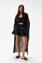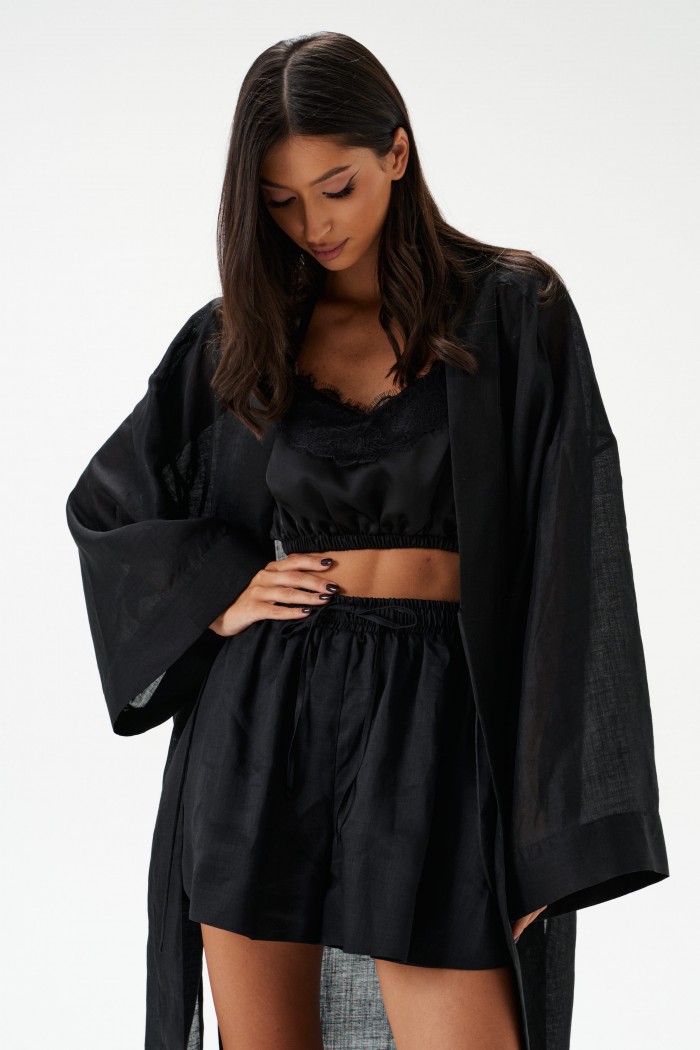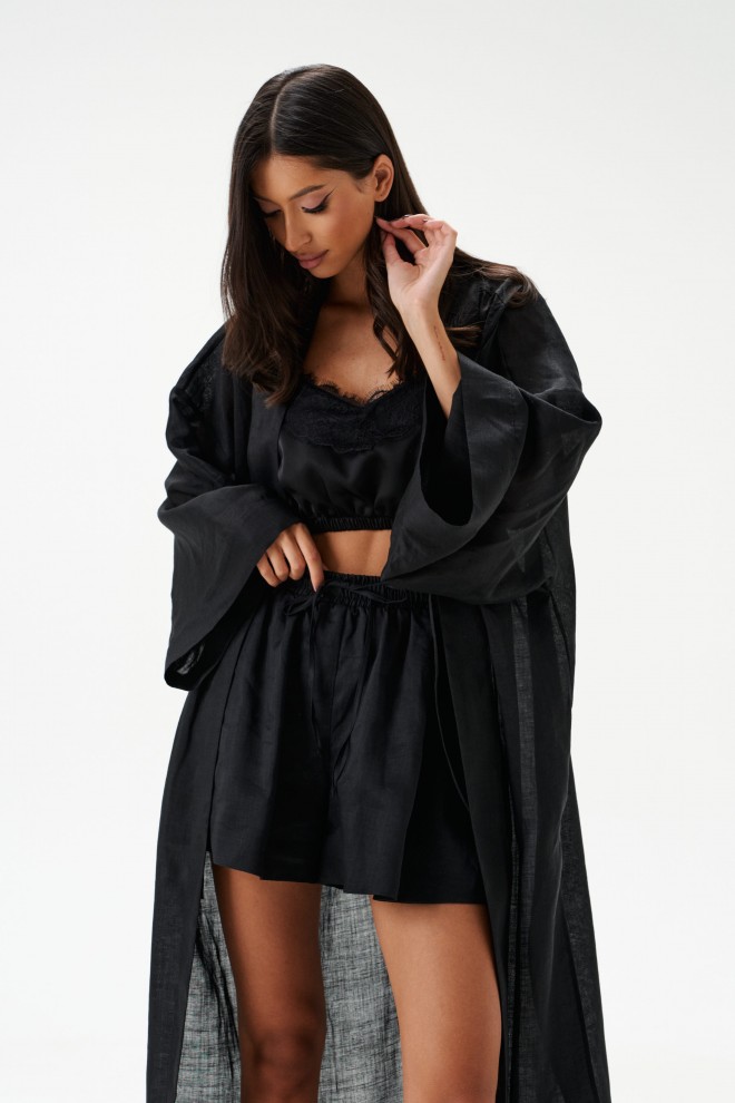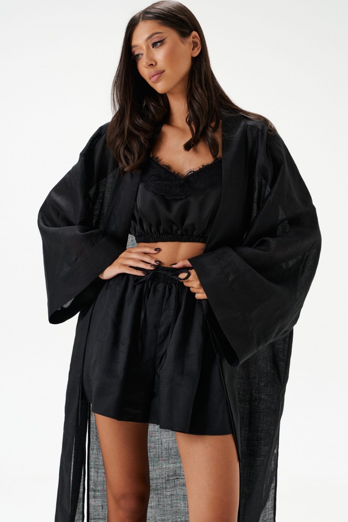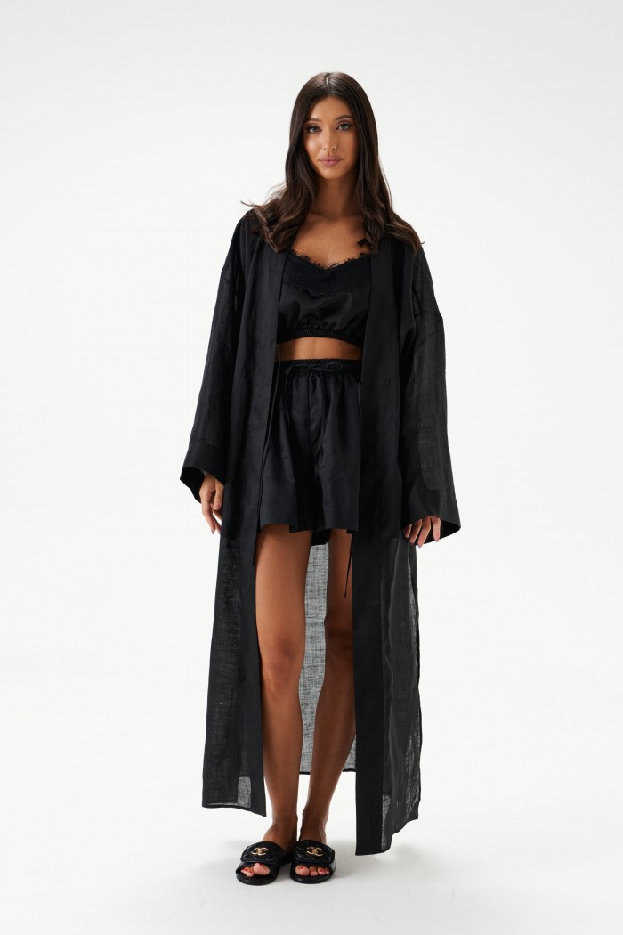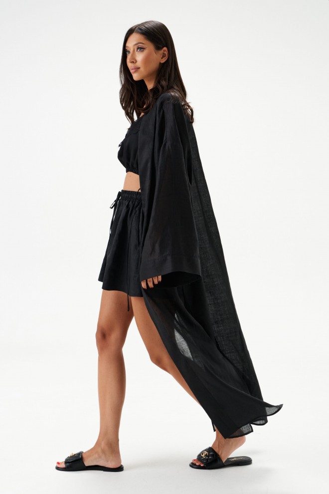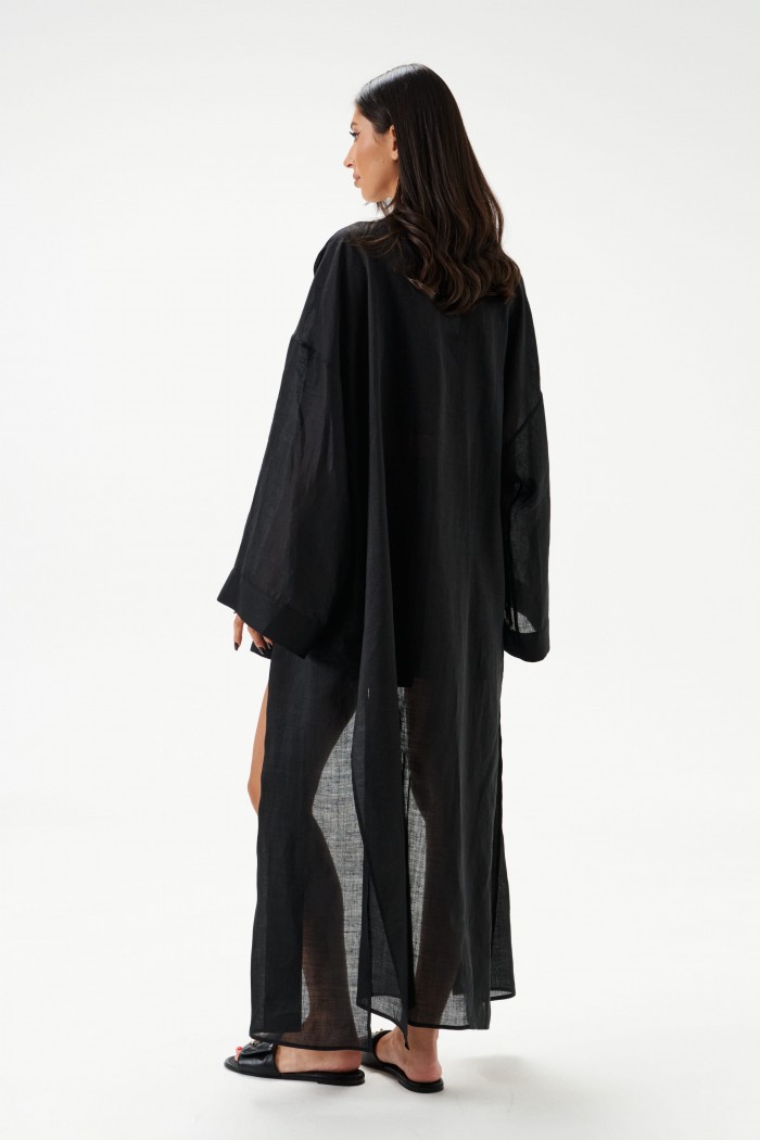 Кардиган прямого кроя, выполнен из натурального полотна рами. Вырез горловины V-образный. Застёжка центральная на завязки. Рукав широкий, втачной, спущен. Длина боковых разрезов 67 см. Длина рукава от линии горловины 76 см. Длина спинки 130 см.