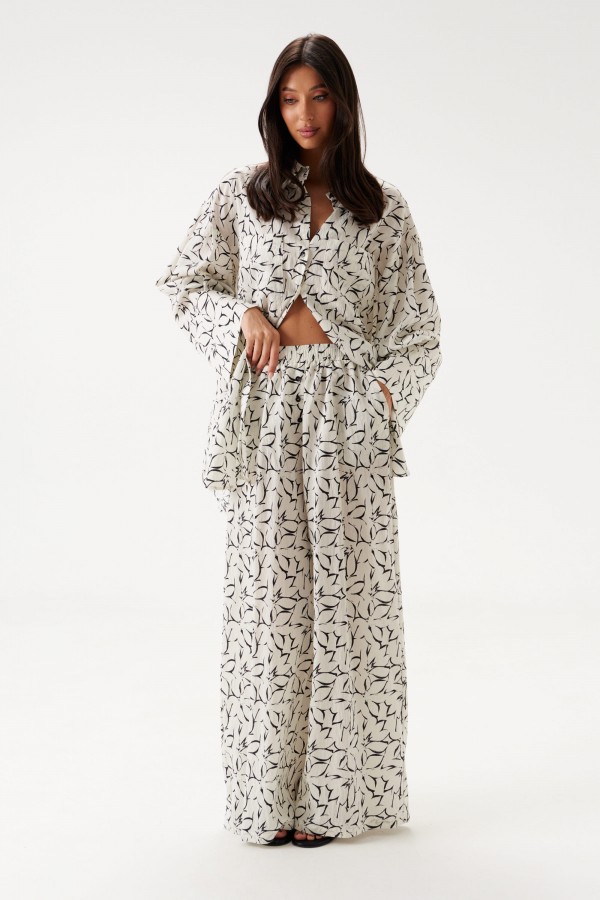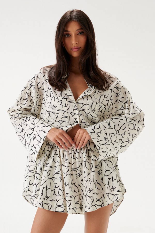 Блузка прямого свободного кроя, выполнена из текстильного полотна серо-бежевого цвета с цветочным принтом. Характеристики: воротник отложной, застежка центральная на петли пуговички, рукав втачной, по низу рукава манжета ,