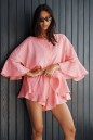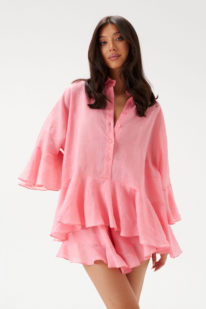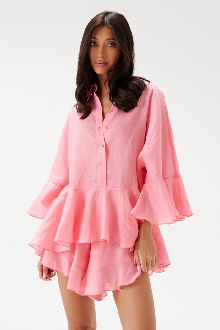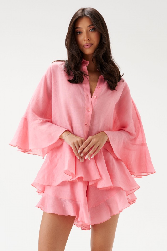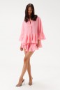 Блузка свободного кроя, выполнена из лёгкого натурального полотна розового цвета – рами. Воротник рубашечного типа, застежка центральная на петли пуговички, крой рукава «летучая мышь». Низ изделия и рукава декорированы воланом из основной ткани изделия. Длина по спинке с учетом волана - 73 см. Длина рукава от горловины - 60 см.