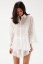 Блузка свободного кроя, выполнена из лёгкого натурального полотна белого цвета – рами. Воротник рубашечного типа, застежка центральная на петли пуговички, крой рукава «летучая мышь». Низ изделия и рукава декорированы воланом из основной ткани изделия. Длина по спинке с учетом волана - 73 см. Длина рукава от горловины - 60 см.