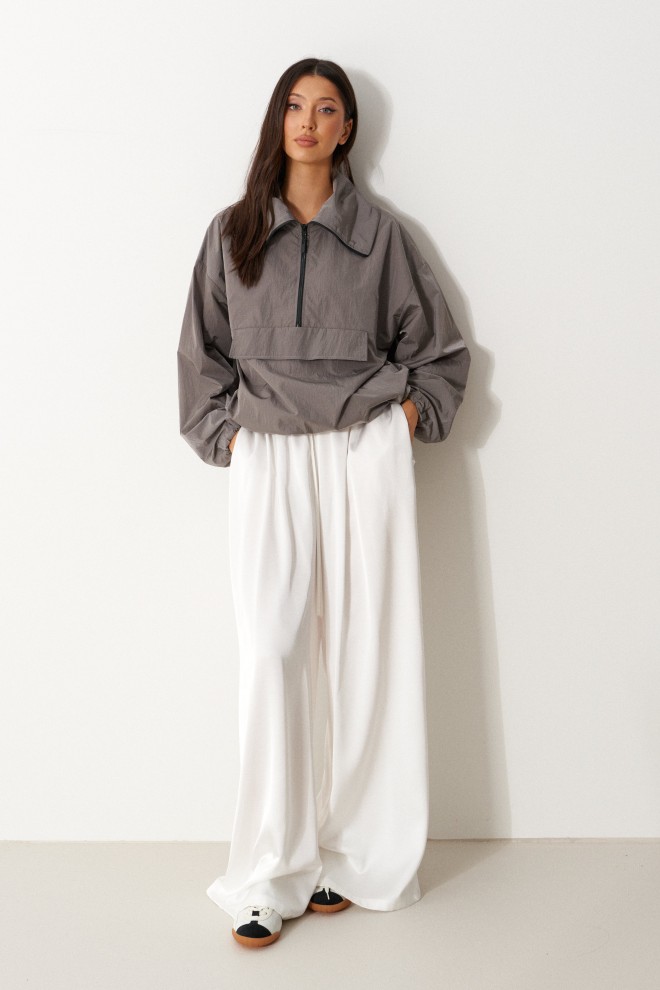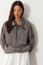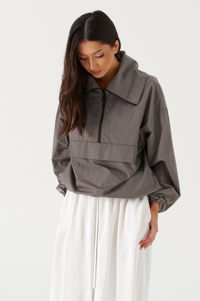Блузон прямого свободного кроя выполне из плащевки графитового цвета. Характеристики: прямой крой, широкий отложной воротник, застежка центральная - молния, спереди имитация кармана, рукав втачной спущенный, манжет на резинке с фиксатором, по низу изделие собирается на резинку с фиксаторами. Длина рукава от края горловины 75см, длина по центру спинки от края горловины 68см.