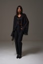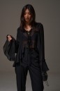 Блуза свободного кроя. Выполнена из мягкого прозрачного полотна чёрного цвета. Вырез горловины V-образный, с воланом по всей длине (переходит на спинку). Рукав втачной, спущенный, по низу волан с кулиской. Низ блузы по переду фигурный с воланом, волан переходит на спинку. Застёжка центральная - завязки. Длина рукава от линии втачивания 72 см. Длина спинки 71 см