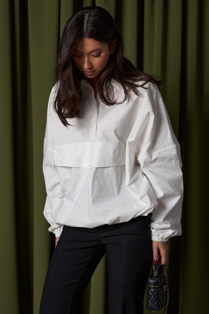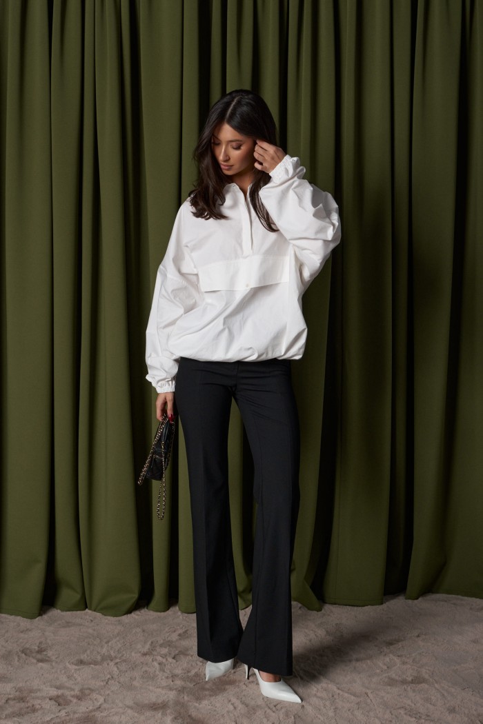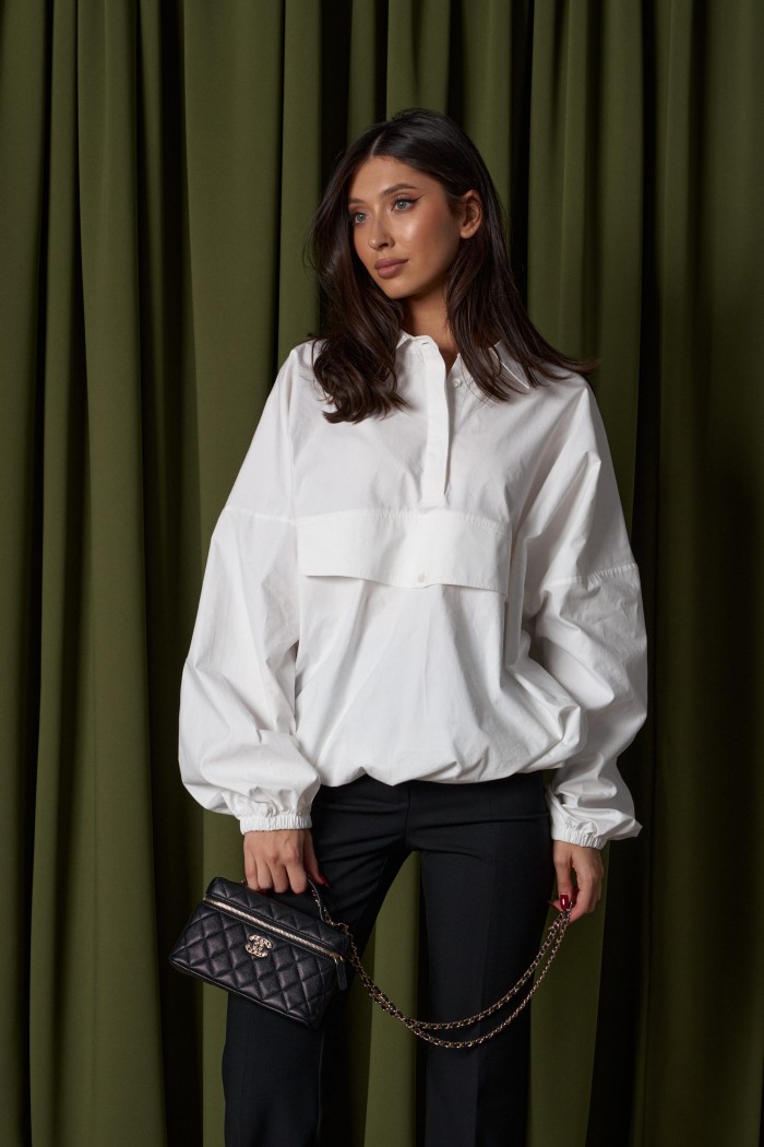 Блузон прямого свободного кроя выполнен из хлопковой ткани. Характеристики: отложной воротник, застежка центральная на петли пуговицы, по переду имитация кармана. Низ изделия на резинке с фиксатором. Плечо спущенно, рукав свободный, низ рукава на резинке. Длина по спинке 71см, длина рукава от края горловины 81см.