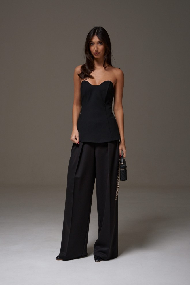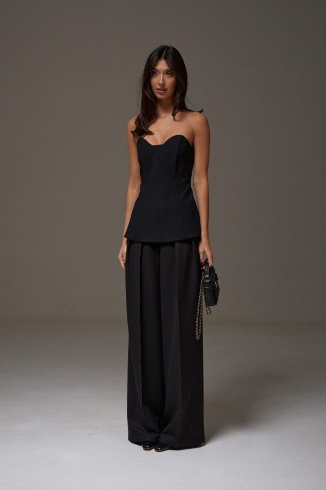 Корсет с фигурным вырезом выполнен из костюмного полотна черного цвета. Характеристики: прилегающий силуэт, подкладка, фигурный вырез горловины, по передней части изделия и в боковых швах упругие узкие пластины, по заднему полотну в среднем шве потайная молния. Длина по центру спинки 41см.