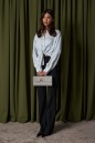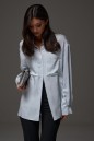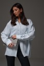 Рубашка свободного кроя выполнена из тексильного мягкого полотна небесного цвета в белую полоску. Характеристики: прямой крой, отложной воротник, застежка центраяльная на петли-пуговицы, рукав втачной, немного спущен, широкая манжета на двух пуговицах, в боковых швах разрезы 27см, на груди функциональные накладные карманы. Длина рукава от края горловины 75см, длина по центру спинки 70см.
