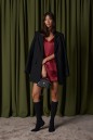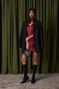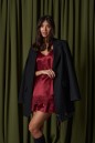 Блузон в крое трапеция, выполнен из струящейся ткани бордового цвета. Характеристика: крой трапеция - расширяется к низу, широкие бретели, спереди v-образный вырез, по спинке овальная горловина, спинка изделия чуть удлинена, по низу изделия пришито кружево. Длина изделия по центру спинки 66 см ( с учетом кружева).