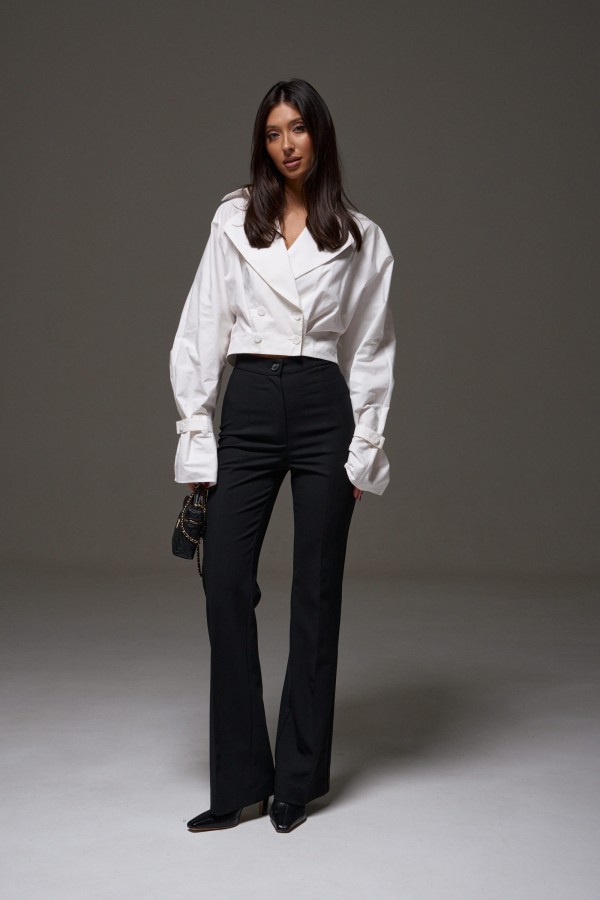 Корсет прилегающего силуэта из черной костюмной ткани. Характеристики: прилегающий силуэт, брендированная подкладка, прямой вырез горловины, по передней и задней части изделия прошиты строчки, по заднему полотну в среднем шве потайная молния. Длина по центру спинки 36см.