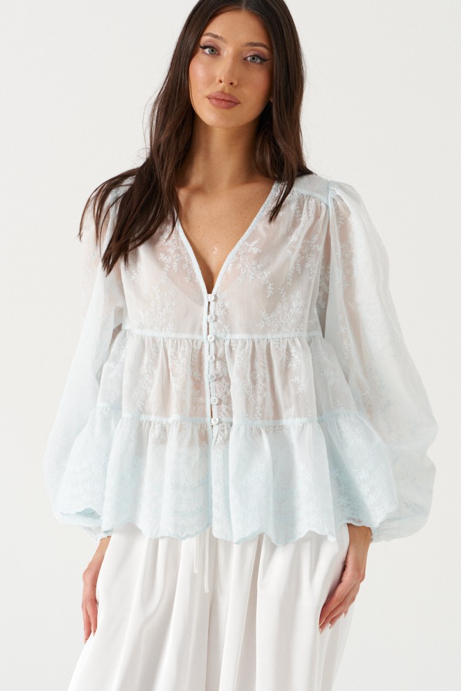 Блузка свободного кроя выполнена из полупрозрачной ткани с вышивкой голубого цвета. Характеристики: вырез V-образный, отрез по линии груди с двумя воланами, кокетка со сборкой, рукав вточной широкий, манжет на на резинке, застёжка на воздушные петли. Длина по центру спинк 59 см, длина рукава от края горловины 76 см.