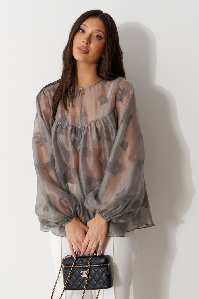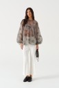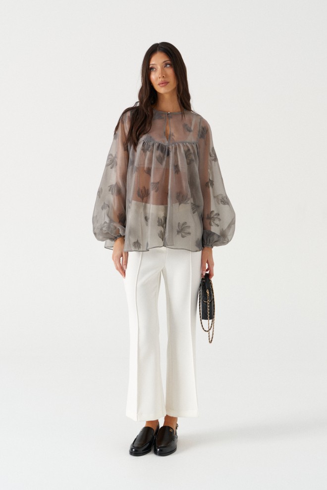 Блуза свободного кроя. Выполнена из прозрачной ткани серого цвета. Горловина круглая. Рукав втачной, внизу на резинке. Застёжка центральная - пуговка. Спинка и передняя части отрезные со сборкой. Длина рукава от линии втачивания 66 см. Длина спинки 67 см