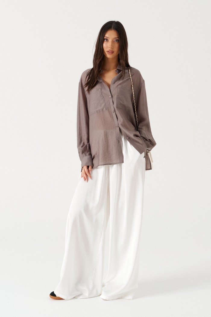 Блузка женская прямого силуэта, свободного облегания. Выполнена из черного полупрозрачного полотна. Характеристика: Воротник отложной на стойке. Рукав одношовный, втачной, со спущенной линией плеча. На переде по линии груди настрочены прямоугольные накладные карманы. Спинка цельная. В боковых швах обработаны разрезы. Застежка центральная, цельнокроеная планка, застегивающаяся на пробивные петли, пришивные пуговицы. На манжетах декоративная пуговица. Длина рукава 60 см, длина плеча 20 см, длина блузы по спинке 69 см.