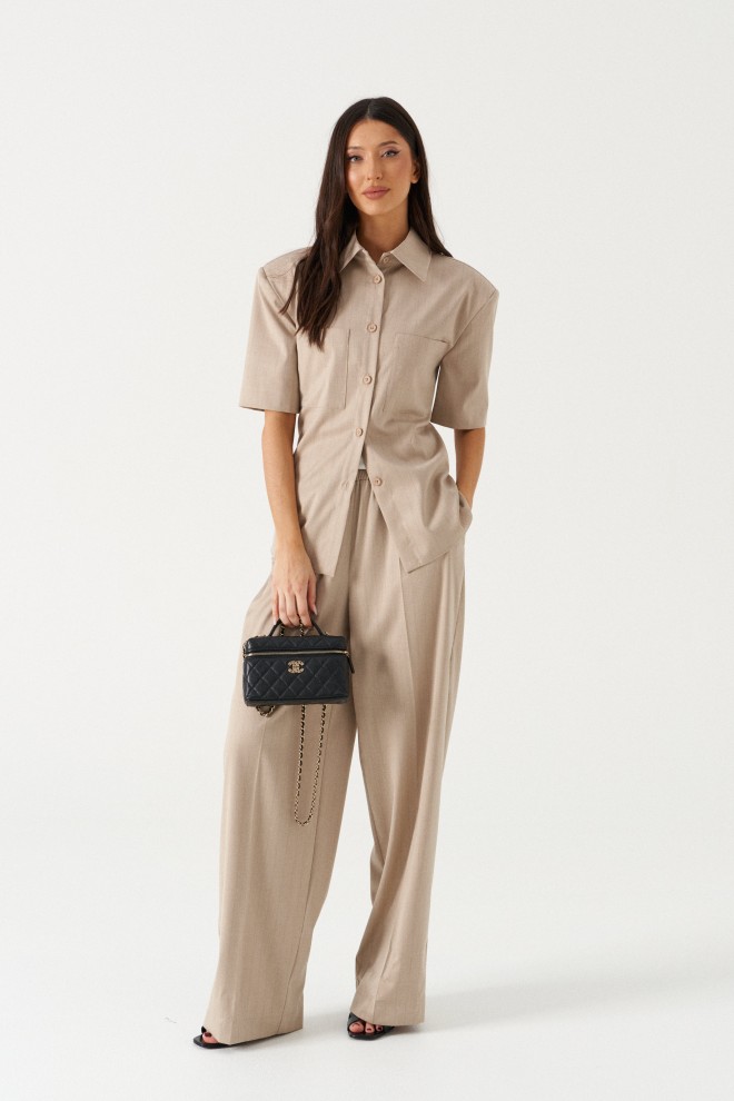 Блузка прямого силуэта выполнена из текстильного полотна песочного цаета в полоску. Характеристики: прямой крой, верх на подкладке, воротник отложной на стойке,