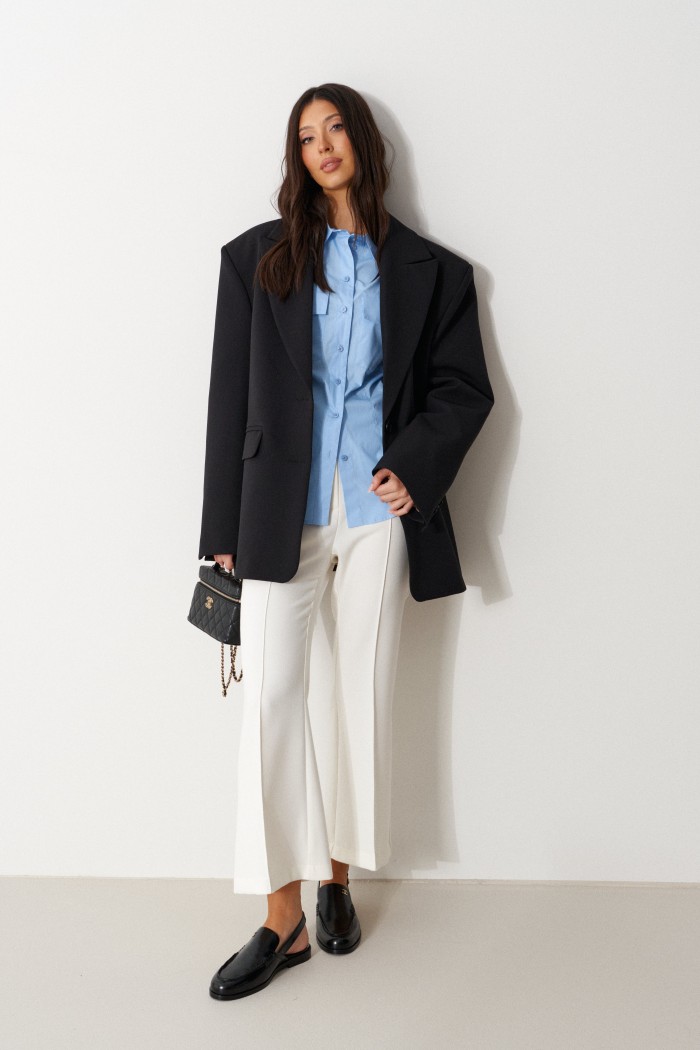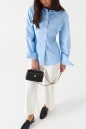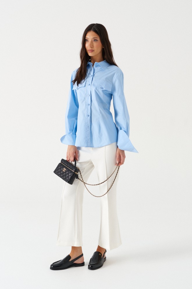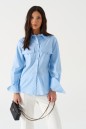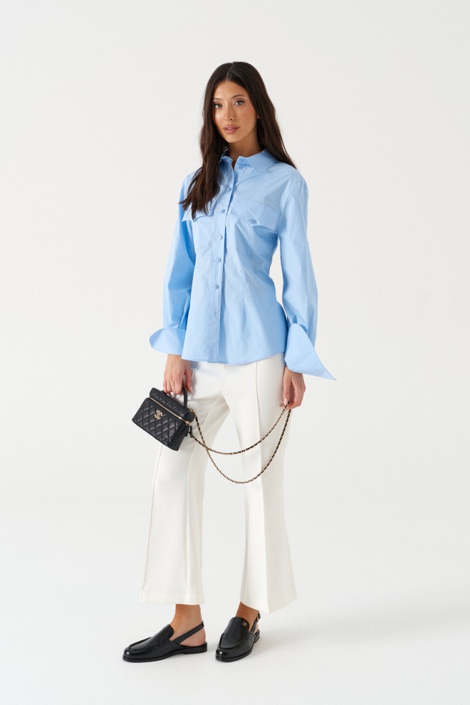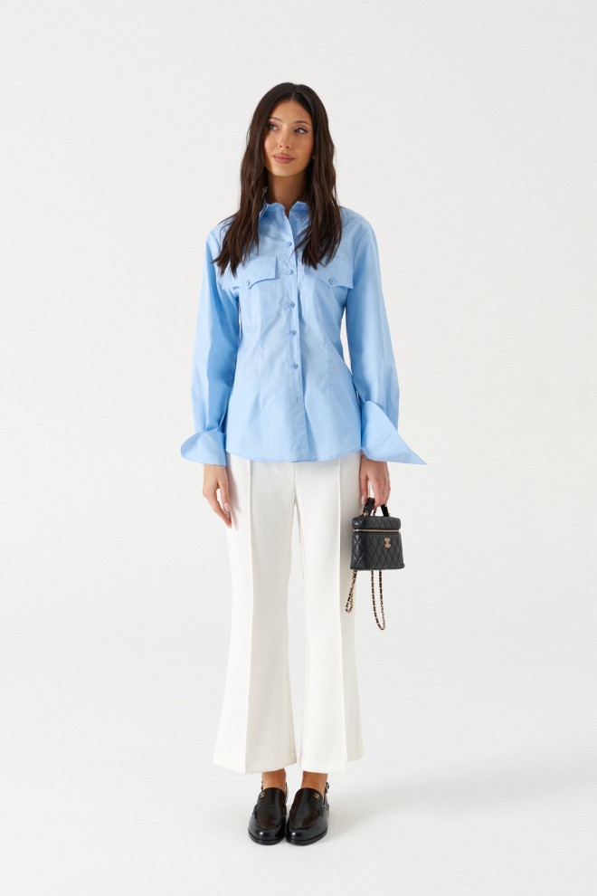 Блузка полуприлегающего силуэта, выполнена из ткани голубого цвета. Характеристики: отложной воротник, застежка центральная на петли пуговицы, карманы по передней части изделия с клапанами, талиевые вытачки по переду и спинке изделия, втачной рукав, по низу рукава манжета с завышенным разрезом, на пуговицах, низ изделия с плавным срезом, на спинке центральный простроченный шов. Длина по центру спинке 65 см, длина рукава от шва втачивания 65 см.