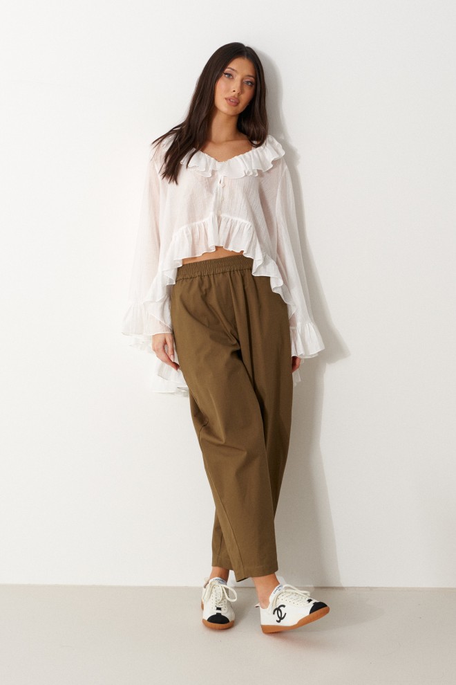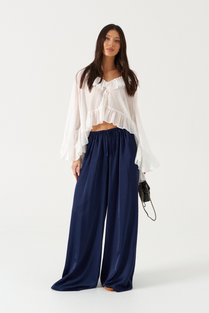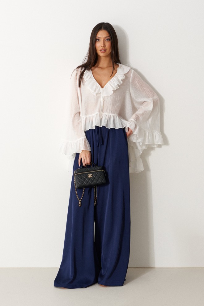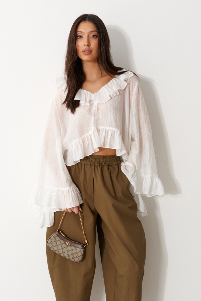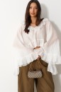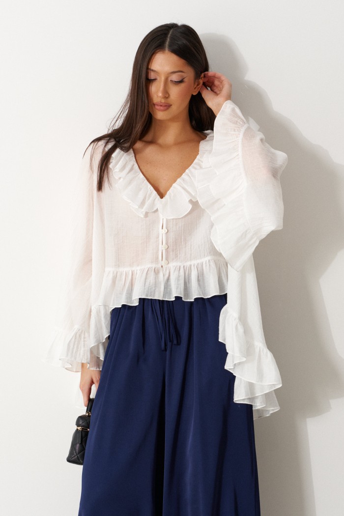 Блузка свободного кроя. Выполнена из мягкого полупрозрачного полотна белого цвета. Вырез горловины V-образный, с воланом по всей длине (переходит на спинку). Рукав втачной, свободный, по низу нашит волан. Низ блузы по переду фигурный с воланом, волан переходит на спинку. Спинка удлиненная. Застёжка центральная на петли-пуговицы . Длина рукава от линии втачивания 57 см. Длина спинки 76 см