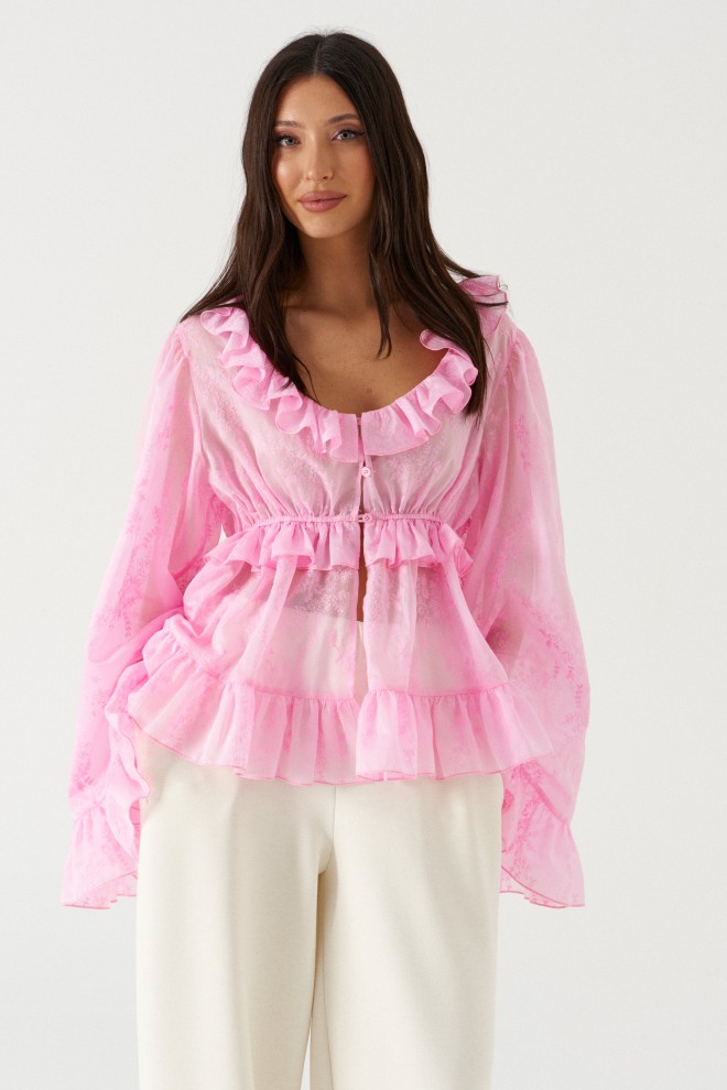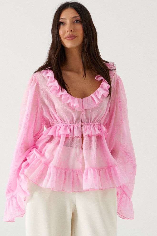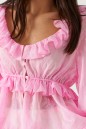 Блузка силуэта трапеция, выполнена из полупрозрачного полотна розового цвета с вышивкой. Характеристики: горловина круглая с отложной рюшей, рукав втачной, слегка спущен. По верху рукава сборка, по низу притачная рюша. Чуть выше линии талии блузка присборена на резинку. Застежка центральная, по верхней части лифа, на навесные петли - пуговицы.