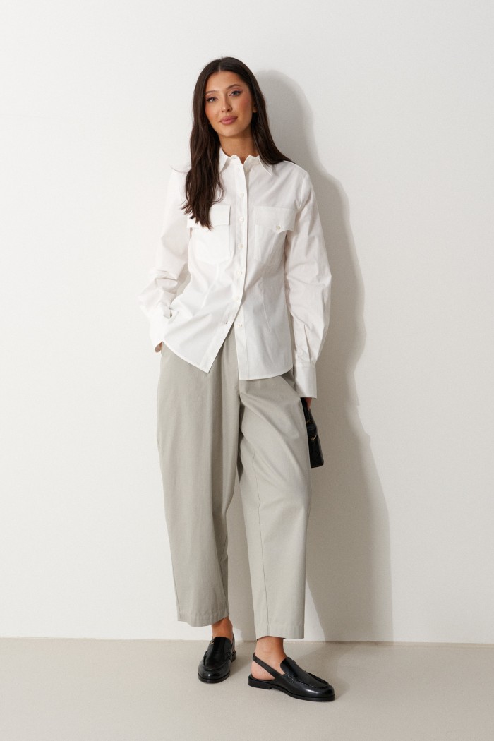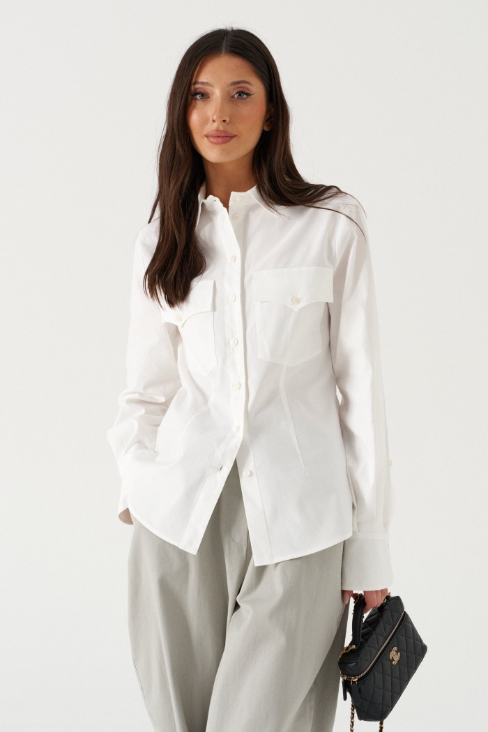 Блузка полуприлегающего силуэта, выполнена из ткани белого цвета. Характеристики: отложной воротник, застежка центральная на петли пуговицы, карманы по передней части изделия с клапанами, талиевые вытачки по переду и спинке изделия, втачной рукав, по низу рукава манжета с завышенным разрезом, на пуговицах, низ изделия с плавным срезом, на спинке центральный простроченный шов. Длина по центру спинке 65 см, длина рукава от шва втачивания 65 см.
