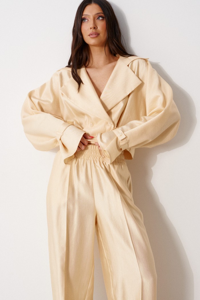 Рубашка свободного кроя, выполнена из мягкой ткани. Характеристики: отложной воротник с остроугольным лацканом, двубортная застежка на пуговицах, крой рукава «летучая мышь», по низу рукава пата с пуговицей, низ изделия на обтачке. Длина спинки 45 см, длина рукава от края горловины 78 см.