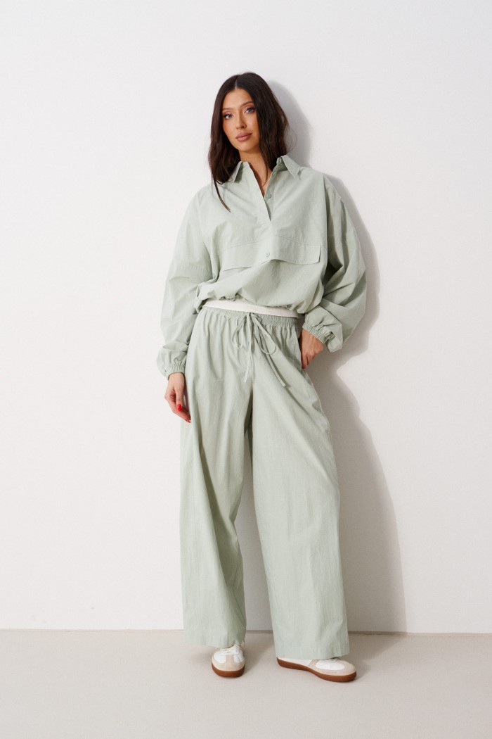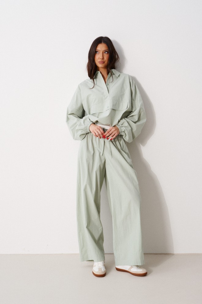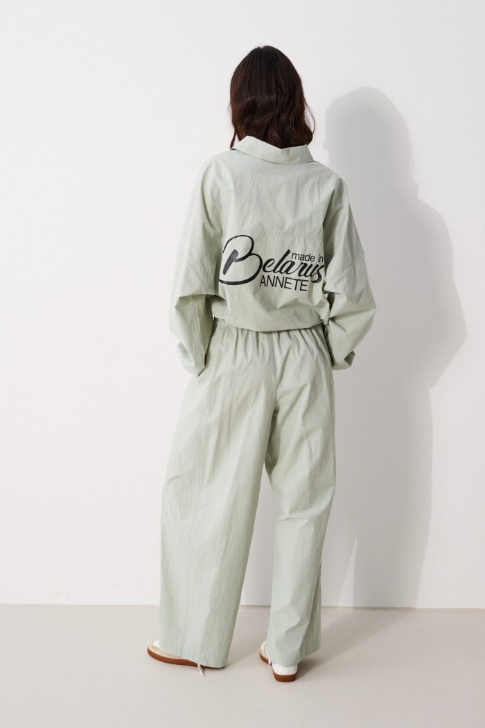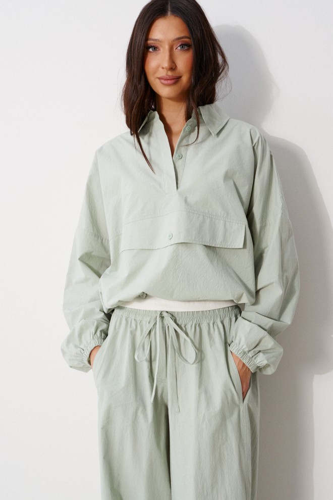 Блузон прямого свободного кроя выполнен из хлопковой ткани, в оттенке светлой оливы. Характеристики: отложной воротник, застежка центральная на петли пуговицы, по переду имитация кармана. Низ изделия на резинке с фиксатором, на спинке расположена надпись "Made in Belarus. Annete". Плечо спущено, рукав свободный, низ рукава на резинке. Длина по спинке 58 см, длина рукава от края горловины 83 см.